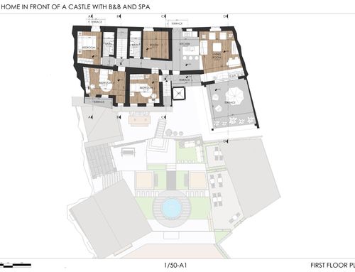I would like to build an apartment on the upper floor where to live, on the lower floors there are 3 lodgings with n.03 rooms each and n.02 bathrooms to be used as a 12 bed b & b. Modern style leaving the external shape of the building unchanged. In the cottage I would like to build a small breakfast room on the first floor and a spa on the ground floor.