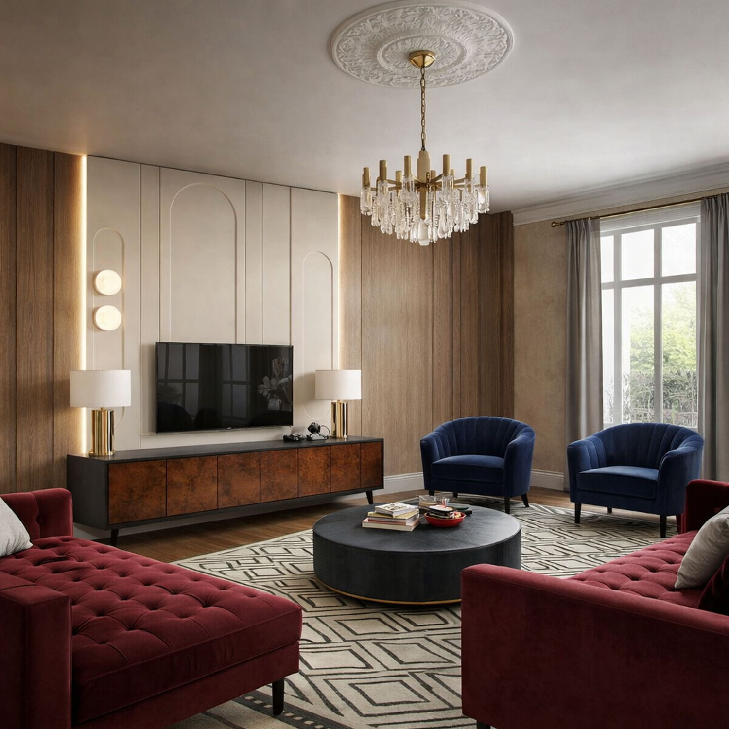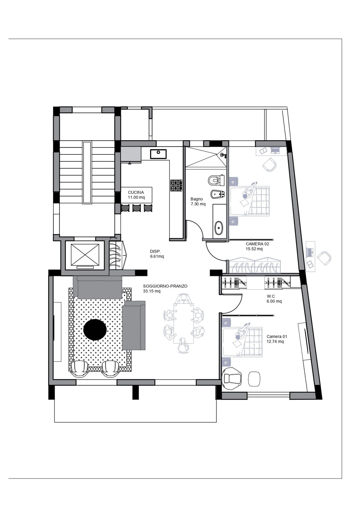 La proposta rispetta la disposizione originale dell'appartamento, spostando le pareti originali per creare una sensazione di maggiore spaziosità e rimuovendo la parete divisoria tra il soggiorno e la sala da pranzo. Inoltre, le partizioni esistenti nelle camere da letto permettono alla luce naturale di filtrare nelle cabine armadio dalle finestre. Anche le pareti del soggiorno sono state rinnovate e tutti gli arredi sono stati modernizzati con pezzi di ispirazione vintage: linee pulite, legni caldi e illuminazione, creando un'atmosfera elegante, funzionale e coesa che fonde gli elementi esistenti con le nuove aggiunte.