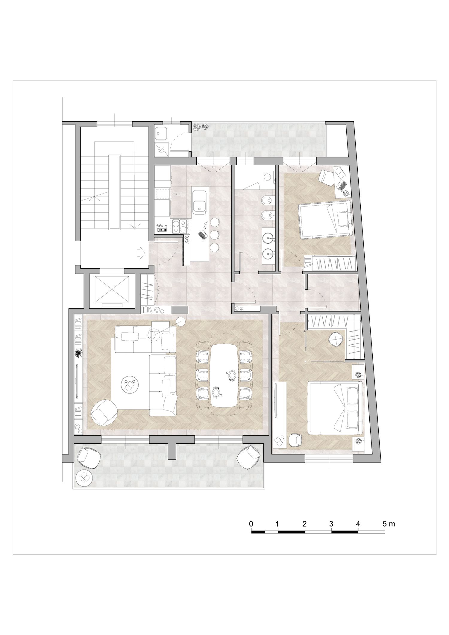7. creare un dialogo creativo fra la pavimentazione in marmo, che verrà estesa al bagno ed alla cucina, con il nuovo pavimento in parquet in rovere a posa chevron, che verrà inserito nel soggiorno e nelle camere. In questi locali, verrà realizzata una cornice pavimentale con lo stesso marmo già esistente, ed il parquet verrà inserito a creare una sorta di "effetto tappeto", per dare continuità visiva fra passato (marmo) e futuro (rovere).