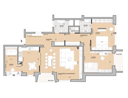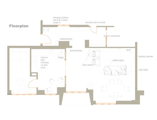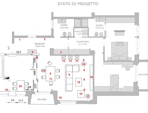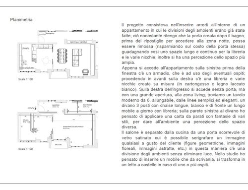 Nell'ingresso ci piacerebbero delle nicchie e una libreria. Ci sarà anche un armadio per i vestiti degli ospiti che ci vengono a trovare. La nicchia è già predisposta nel progetto. Allego la piantina dello stato attuale e alcune immagini di arredi che mi piacciono. La planimetria non la vorrei modificare. La disposizione degli arredi indicati nella planimetria allegata può essere cambiata come ritenete opportuno.