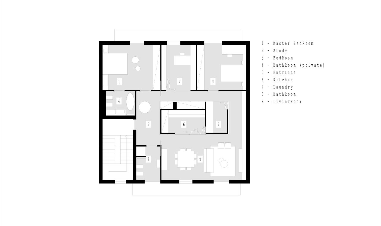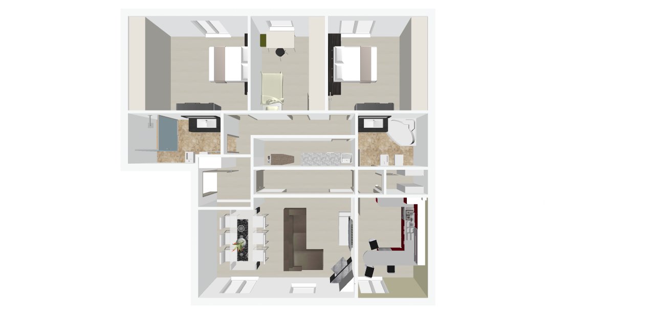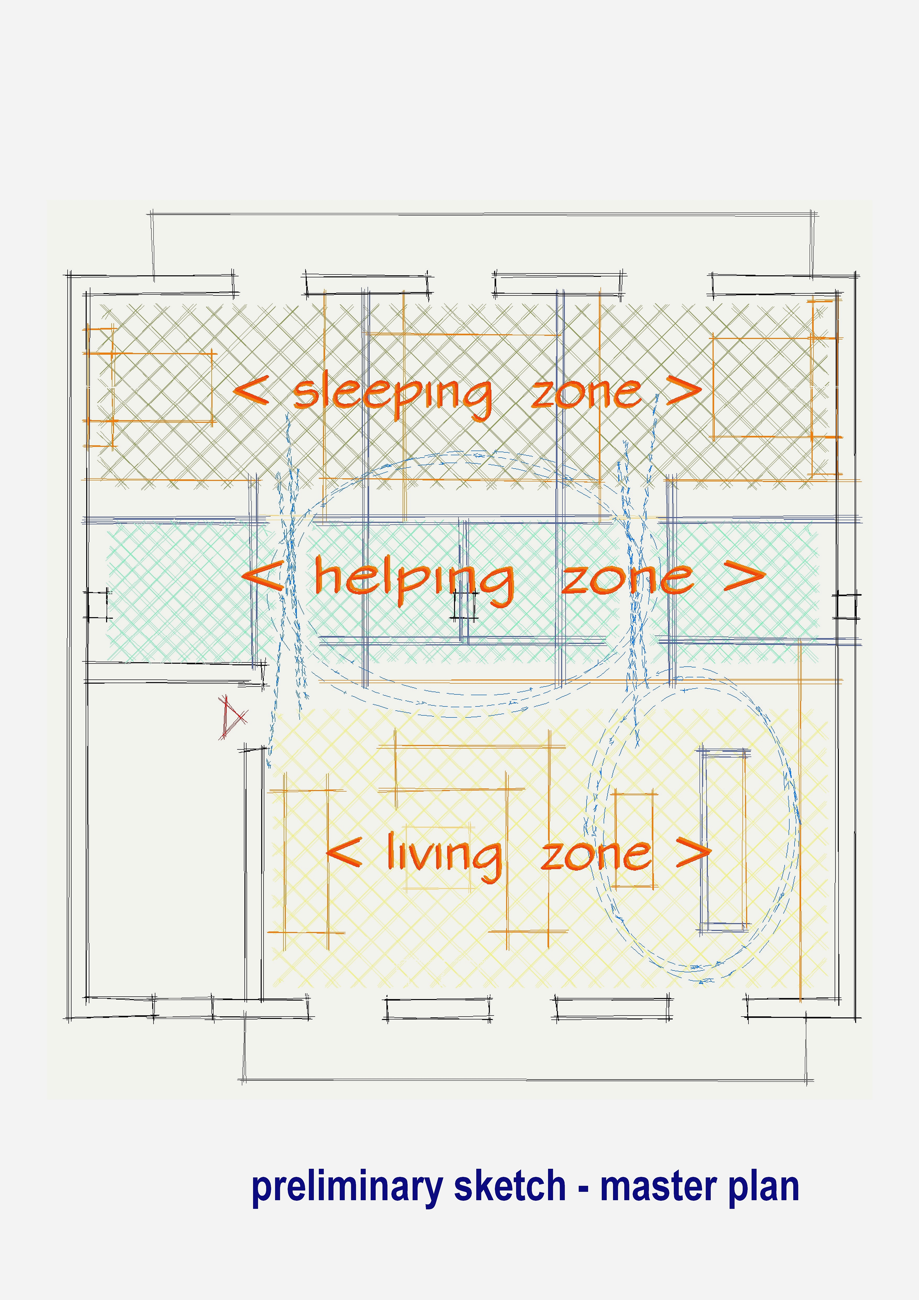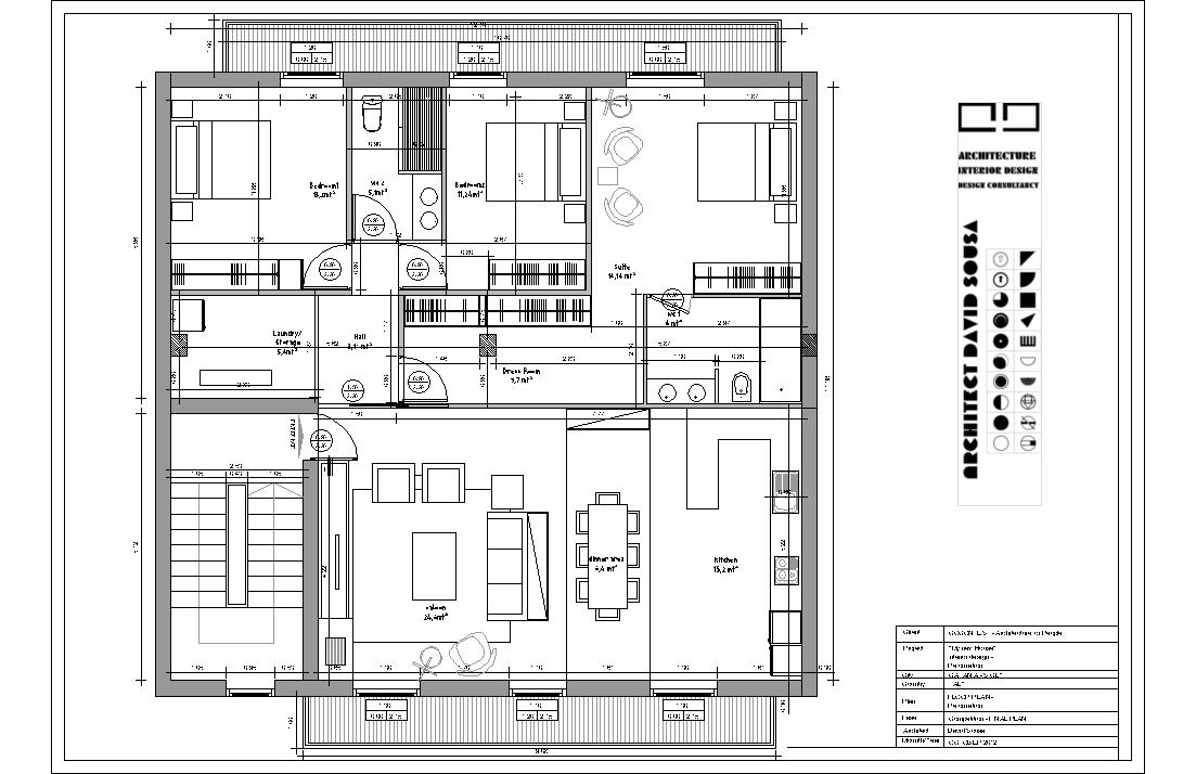 The house is under construction. In this space I would like to get: 1 large bedroom, 2 bedrooms, kitchen, 2 bathrooms, a laundry room, a storage room, living room (preferably at the entrance of the house)