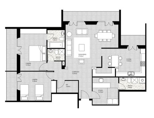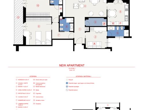 Attualmente l'appartamento ha 2 bagni 2 camere da letto, cucina, sala, studio ed uno sgabuzzino.