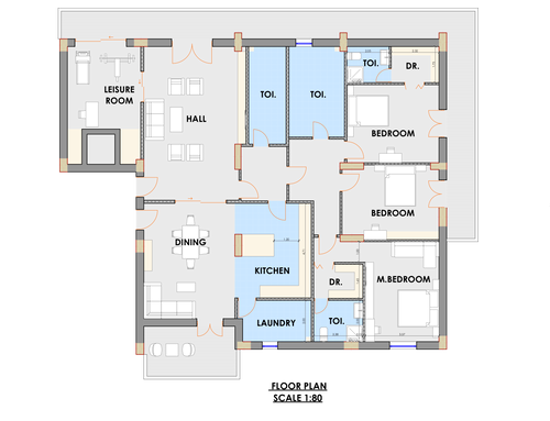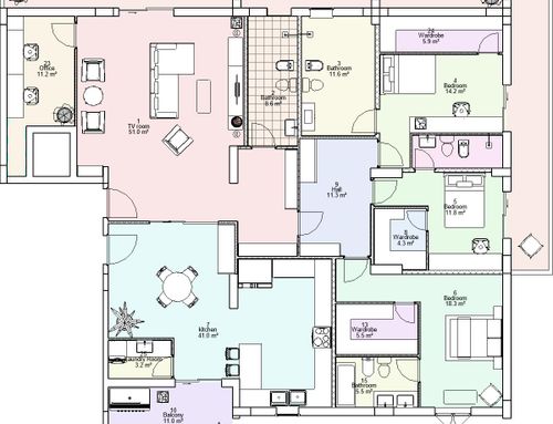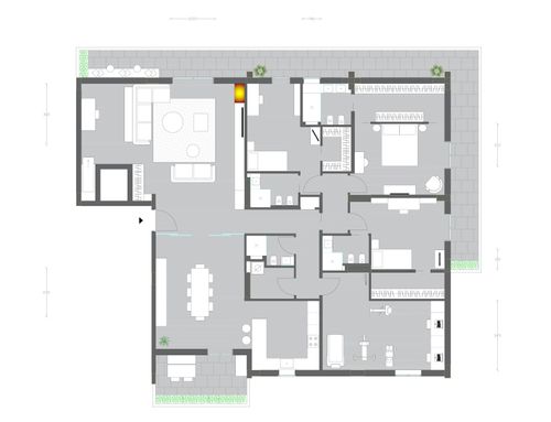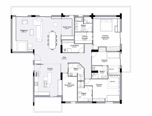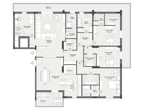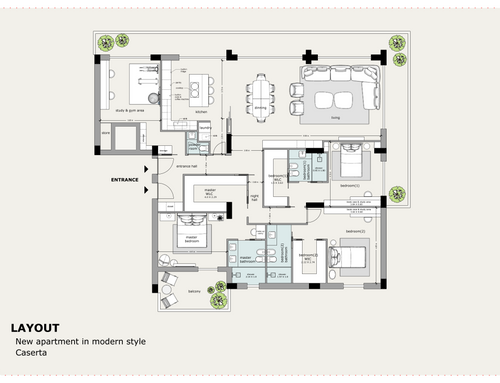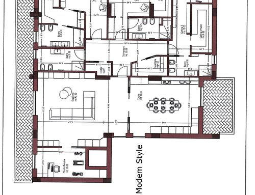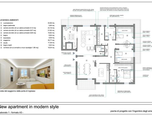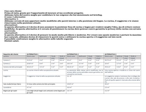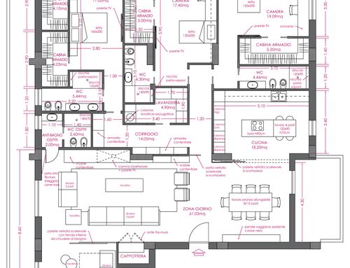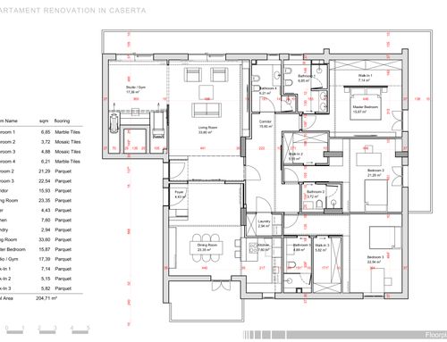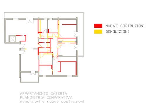 Hello everyone, my wife and I are the owners of an apartment of about 215 net square meters on the third floor of an apartment building in the center of Caserta. The construction dates back to the 90s and it is our intention to completely renovate it in a modern style before going to live there. The house has large bedrooms (3), two of which are very large and one smaller. Our idea is to make the sizes of these rooms more uniform and to add a walk-in closet and, if possible, a bathroom in each room. For the walk-in wardrobes we have evaluated that the space available to each room should not be less than 5 square meters, all of which can be used at full height. For the bathrooms, on the other hand, if the singles in the room are too small, we also evaluate the possibility of having three bathrooms in total, including the one for guests who must, in each solution, maintain its own independence from the sleeping area, serving instead of that day, not spread out in the rooms, each with large showers. Furthermore, one of our needs is to obtain from this apartment a laundry and a study / leisure area dedicated to my wife and me that can contain both the desk with the PC and some small sports equipment. As for the style, we love a modern, bright style, with colors more towards the clear and possibly false ceilings for lighting and air conditioning. In general we like home automation and everything that is automation. We do not have a particularly large budget and would prefer to implement a renovation that can be completed in stages over time without sacrificing the validity and beauty of the renovation project itself. Our family consists of four people including a boy of 13 and a girl of 10. As for the living area, currently the apartment is structured with a large kitchen connected to the living room through a large sliding glass door that guarantees the privacy of the kitchen itself which is also equipped with its own independent entrance door, while the other entrance door opens right into the room. We like the idea of maintaining this conformation, not disdaining to obtain the possible study area in a part of the room, perhaps creating some opening on the north side. Obviously we also evaluate other solutions that you will want to offer us while maintaining a large kitchen that is smile in some way from the dining room area but that can become a whole when needed. To you technicians the feasibility analysis!