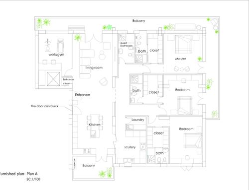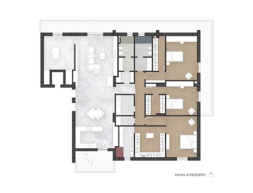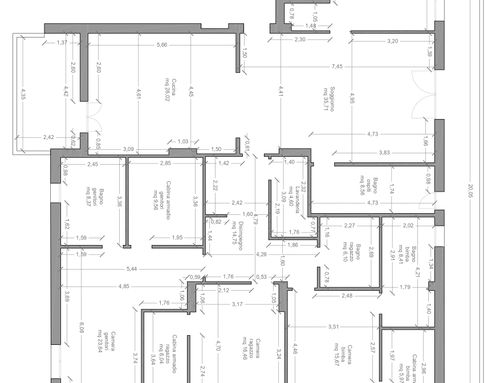 Hola a todos, mi mujer y yo somos propietarios de un piso de unos 215 metros cuadrados netos en la tercera planta de una urbanización en el centro de Caserta. El edificio data de los años 90 y tenemos la intención de renovarlo completamente en un estilo moderno antes de mudarnos. La casa tiene grandes habitaciones (3), dos de ellas muy grandes y una más pequeña. Nuestra idea es uniformar el tamaño de estas habitaciones y añadir en cada una de ellas un armario empotrado y, si es posible, un baño. Para los armarios empotrados, estimamos que el espacio disponible en cada habitación no debía ser inferior a 5 metros cuadrados, todos ellos utilizables a plena altura. Para los baños, en cambio, si los baños individuales de la habitación son demasiado pequeños, se evalúa también la posibilidad de disponer de tres baños en total, incluido el de invitados, que debe, en todas las soluciones, mantener su propia independencia de la zona de dormitorios, sirviendo en cambio a la zona de día, no ubicada en las habitaciones, cada una con amplias duchas. Una de nuestras necesidades, además, es obtener de este piso un cuarto de lavado y una zona de estudio dedicada a mi mujer y a mí que pueda contener tanto el escritorio con el PC como algún pequeño equipamiento deportivo. En cuanto al estilo, nos gusta un estilo moderno y luminoso, con colores más claros y posiblemente algunos falsos techos para la iluminación y el aire acondicionado. En general, nos gusta la domótica y todo lo que sea automatización. No disponemos de un presupuesto especialmente elevado y preferimos llevar a cabo una renovación que pueda completarse en varias etapas a lo largo del tiempo sin sacrificar la validez y la belleza del proyecto de renovación en sí. Nuestra familia está formada por cuatro personas, entre ellas un niño de 13 años y una niña de 10. En cuanto a la zona de estar, el piso está estructurado actualmente con una gran cocina conectada con el salón a través de una gran puerta corredera de cristal que garantiza la privacidad de la propia cocina, que también tiene su propia puerta de entrada independiente, mientras que la otra puerta de entrada da directamente al salón. Nos gusta la idea de mantener esta composición, sin excluir la idea de situar ahí la posible zona de estudio en una parte del vestíbulo, tal vez creando algunos huecos adicionales en el lado norte. Evidentemente, también evaluamos otras soluciones que nos quieran proponer, manteniendo una gran cocina que puede estar separada de alguna manera de la zona del salón, pero que puede convertirse en un todo si es necesario. Son ustedes, técnicos, los que deben analizar la viabilidad.