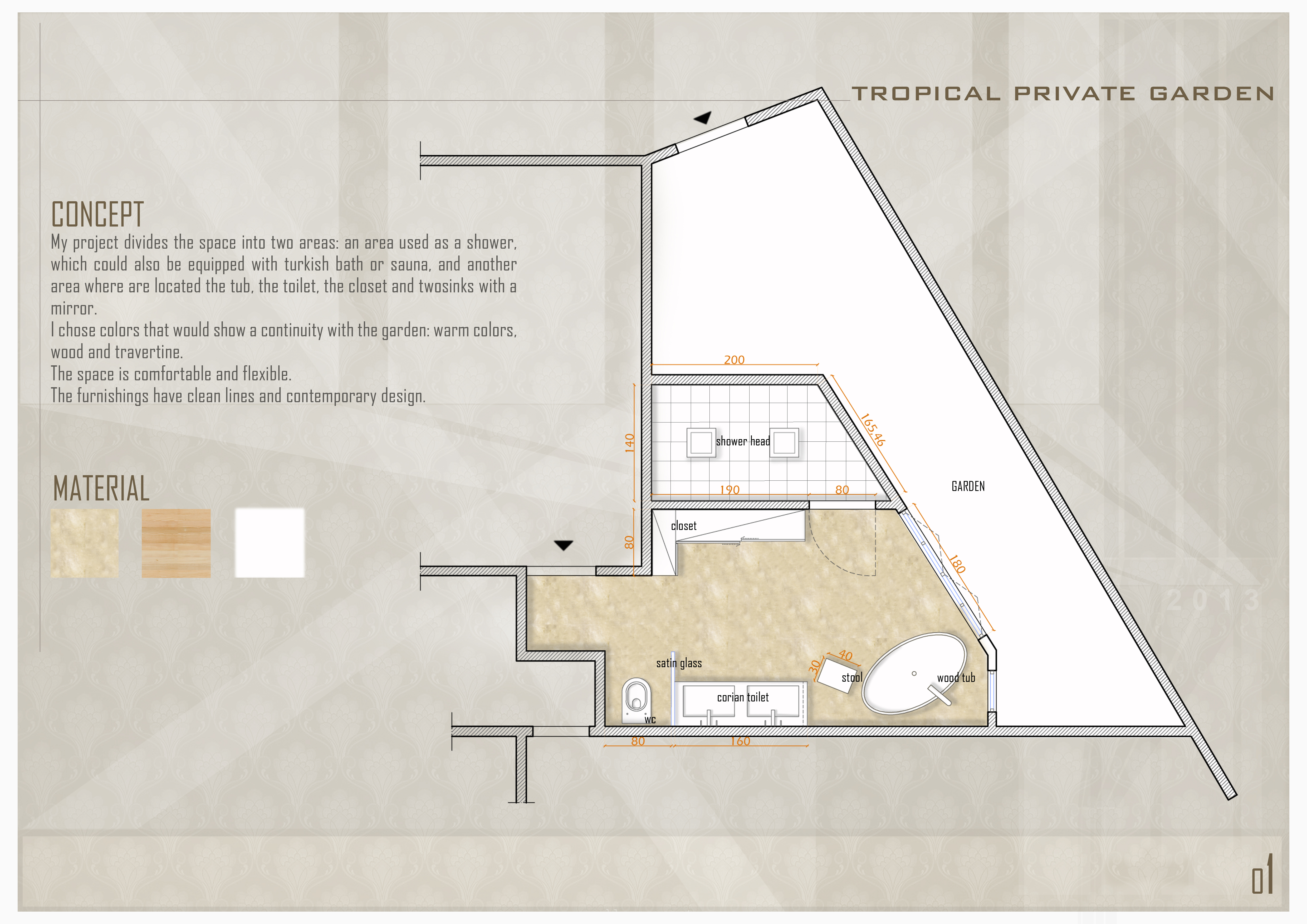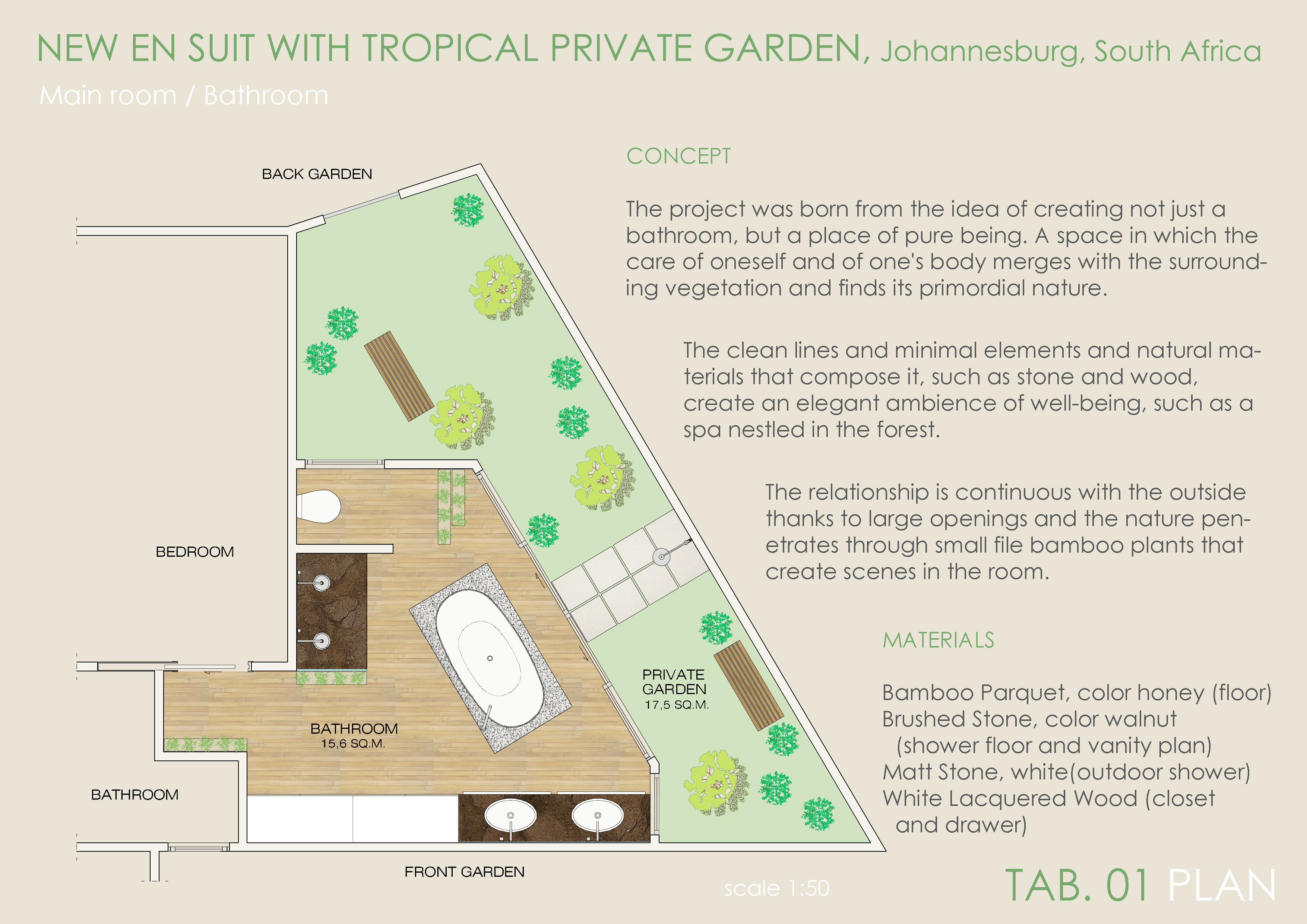 Need to build a new en suit for the master bedroom of my house. There is a private garden next to the bathroom which I want to incorporate. The room and garden need to work well together. Use of glass and sliding stacking doors to create room connected to the outdoors and filled with light. The bathroom needs to include a toilet that is not open to the rest of the room, a free standing bath, a double shower, a double vanity and closet space. The shape of the room is unusual due to building regulations and a 2m building line around the property. I need the space to have a spa feel. I have included a Possible layout under the picture section but nothing is defined. Entire space can be reconfigured how you like to optimise design. The design must be contemporary.