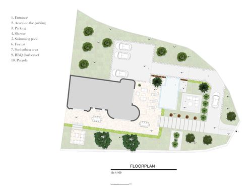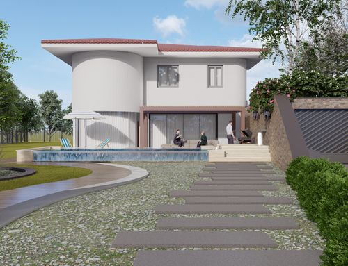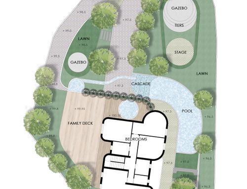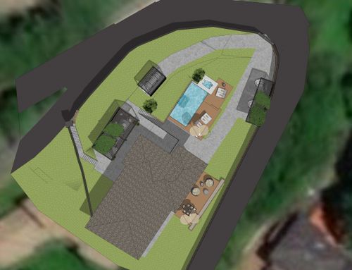Hi and very happy, I have a garden that slopes to the two floors of the house under construction, all still to be completed, with a terraced garden area and now let's say a "scarp" that reaches the upper road, with the possibility of others access from the street. in the garden we would like to create a garage area, better underground behind the house, see drawing, then a relaxation area with a wooden porch perhaps connected to the first floor of the house, and a ground floor area of the house with panoramic windows overlooking the pool. External hedge for privacy. all the altimetric shape of the garden can be modified at will for the best result, saving only the big tree present if possible.