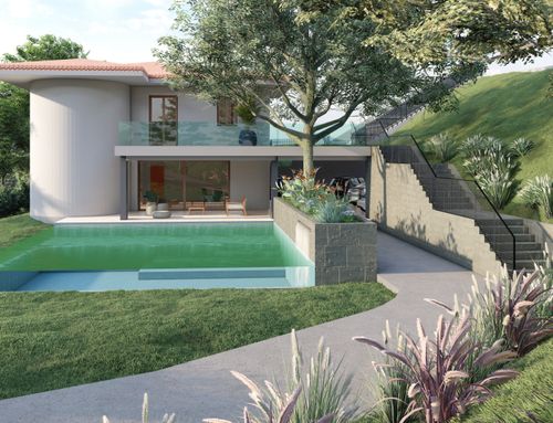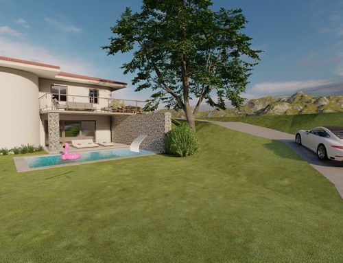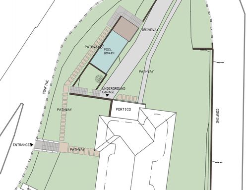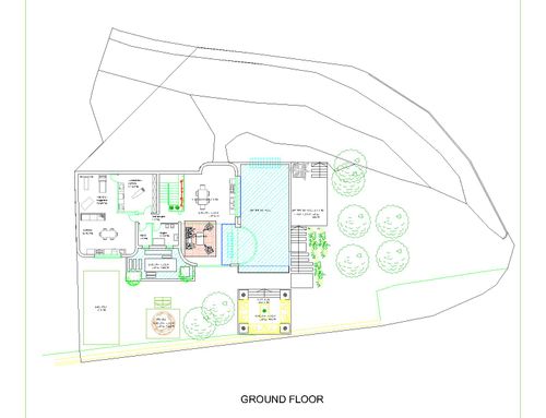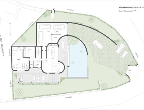 NOTA BENE : vorremmo fare garage nuovo interrato lato sotto il giardino alto casa con ingresso fra casa e albero , o ingresso da nuovo scivolo sulla rampa che sale al piano primo , la piscina forse è meglio vicina a casa o lontana ?...la zona è collinare quindi un po fredda . A lato cancello ingresso attuale (modificabile se si vuole ) c è un vano da colmare o da fare parking . piscina su due livelli con cascata puo' esser una idea . molte grazie , a disposizione .