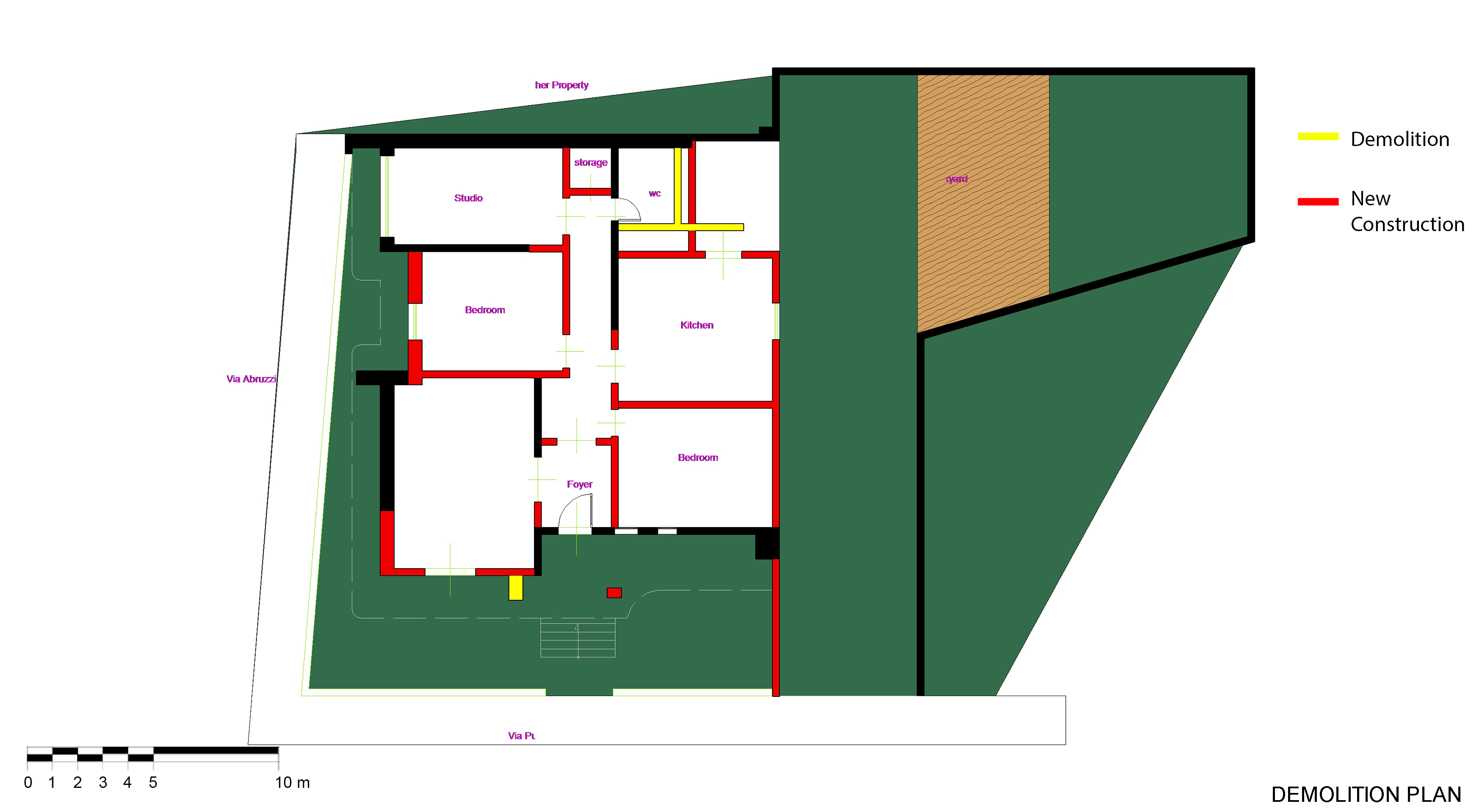 Sul piano esistente vorrei abbattere i muri interni e creare una zona giorno con ampia cucina, zona living, uno o due bagni, lavanderia e uno studio. Vorrei poi creare un piano superiore da adibire a zona notte con una camera da letto con cabina armadio, due letto, e un bagno.