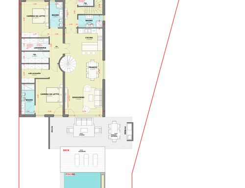 Primo piano 150mt: con cucina soggiorno, ripostiglio, stireria e lavanderia insieme, grande cabina armadio, camera matrimoniale con bagno in camera e camera doppia, due bagni.