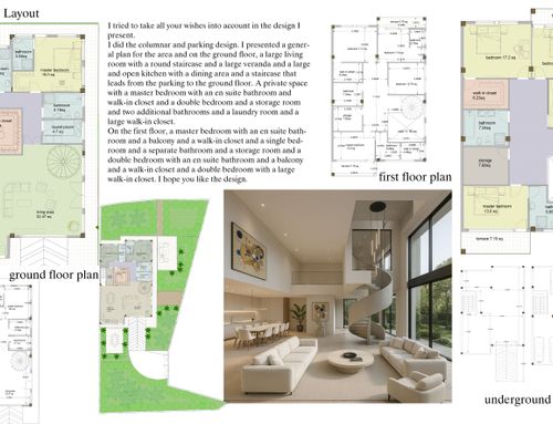I would like the staircase (see references) to be an open-style one, with the mezzanine above. However, it should not take up too much space, because on the upper floor we need to have 4 bedrooms (two with a French bed / small double bed and two with standard double beds), 2 bathrooms (one en-suite and one separate), and 1 walk-in closet inside one of the bedrooms.