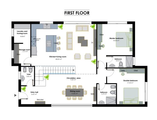 First floor – 150 sqm: kitchen and living room, storage room, combined ironing and laundry area, large walk-in closet, master bedroom with en-suite bathroom, double bedroom, and two additional bathrooms.