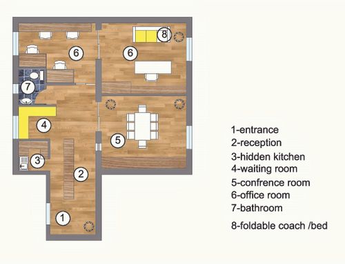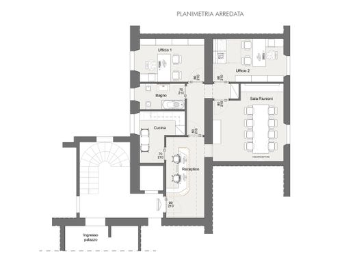 HI EVERYONE, I HAVE AN OFFICE OF 80 SQM. I WOULD LIKE TO HAVE THESE ESSENTIAL ELEMENTS OF A STUDIO: RECEPTION, MEETING ROOM, TWO ROOMS FOR RECEPTION AND STUDIO OF PROFESSIONALS, ONE OF WHICH WITH THE POSSIBILITY TO SLEEP IF ONE FACES LATE (DOUBLE BED). IN THE MEETING ROOM I WOULD LIKE TO PUT A PROJECTOR. AT LEAST 2 SECRETARIES WILL BE ABLE TO WORK IN THE RECEPTION AND IN THE RECEPTION WE THOUGHT TO PLACE A HIDDEN KITCHEN SPACE TO THE PUBLIC (INSIDE A WARDROBE, OR OTHER SOLUTIONS). WE WOULD LIKE SOBER COLORS, WITH A MODERN STYLE,. THE OFFICE WILL ACCOMMODATE CLIENTS OF A LAW FIRM, PEOPLE LOOKING FOR WORK, AND COMPANIES WHO REQUEST ADVICE OF DIFFERENT TYPE IN THE FIELD OF WORK-COMMERCIAL. WE WOULD LIKE TO KEEP THE FLOOR GRAINED. WE WOULD NOT WANT TO DO ELECTRICAL AND THERMO-HYDRAULIC SYSTEMS WORKS. (THE ELECTRIC CABLES WILL BE REPLACED AND REPLACED BY NEW ONES.) SOME SOCKETS AND VARIATIONS MUST BE MADE. A PHOTO IS MISSING OF THE ULTIMATE ROOM ON THE LEFT. THE PALAZZO IS FROM THE 30'S, POPULAR BUILDING DURING THE FASCIST PERIOD