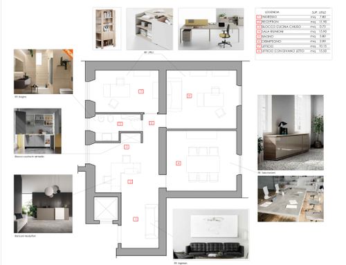 SALVE A TUTTI, HO UN UFFICIO DI 80 MQ. VORREI AVERE QUESTI ELEMENTI ESSENZIALI DI UNO STUDIO: RECEPTION, SALA RIUNIONI, DUE STANZE PER RICEVIMENTO E STUDIO DEI PROFESSIONISTI, DI CUI UNA CON POSSIBILITà DI DORMIRE NEL CASO IN CUI UNO FACCIA TARDI ( LETTO MATRIMONIALE) . NELLA SALA RIUNIONI VORREI METTERE UN VIDEOPROIETTORE. NELLA RECEPTION POTRANNO LAVORARE ALMENO 2 SEGRETARIE E NELLA RECEPTION PENSAVAMO DI METTERE UNO SPAZIO CUCINA NASCOSTO AL PUBBLICO ( DENTRO UN ARMADIO, O ALTRE SOLUZIONI) . CI PIACEREBBERO COLORI SOBRI, CON UNO STILE MODERNO, . L'UFFICIO OSPITERà CLIENTI DI UNO STUDIO LEGALE, PERSONE CHE CERCANO LAVORO, E AZIENDE CHE RICHIEDONO CONSULENZA DI DIFFERENTE TIPO IN TEMA DI LAVORO- COMMERCIALE. VORREMMO MANTENERE IL PAVIMENTO IN GRANIGLIA. NON VORREMMO FARE LAVORI DI IMPIANTISTICA ELETTRICA E TERMOIDRAULICA. ( I CAVI ELETTRICI SARANNO SIFLATI E SOSTITUITI DA QUELLI NUOVI. ) QUALCHE PRESA E QUALCHE VARIAZIONE SI DOVRA' FARE. MANCA UNA FOTO DELL'ULTMA STANZA A SX. IL PALAZZO è DEGLI ANNI 30, EDILIZIA POPOLARE DEL PERIODO FASCISTA