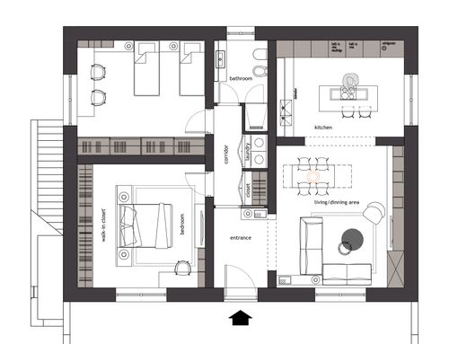 La nostra idea per l'ingresso vede un divisorio in cartogesso nel corridoio principale per separare zona giorno e zona notte, vorremmo quindi rendere la parete una d'arredo e allestire il disimpegno, alle spalle della stessa parete la nostra idea sarebbe quella di creare un piccolo spazio, con un armadio o attrezzando la parete anche alle spalle, da riservare a elettrodomestici tipo lavatrice e asciugatrice, e lo spazio rimanente gestirlo a mo di dispensa. Per quanto riguarda la cucina avevamo pensato di trasformare la finestra già presente in una porta-finestra per facilitare l'ingresso al patio.