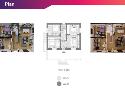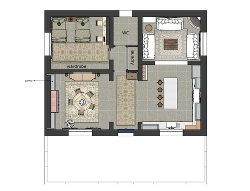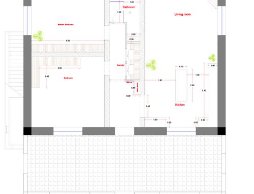 Nuestra idea para la entrada es un tabique de cartón yeso en el pasillo principal para separar la zona de estar y la de dormir, por lo que nos gustaría convertir la pared en un mueble y configurar el pasillo, detrás de la misma pared nuestra idea sería crear un pequeño espacio, con un armario o equipando la pared también detrás de este, para reservarlo para electrodomésticos como lavadoras y secadoras, y el espacio restante para gestionarlo como despensa. En cuanto a la cocina, habíamos pensado en transformar la ventana existente en una puerta-ventana para facilitar la entrada al patio.