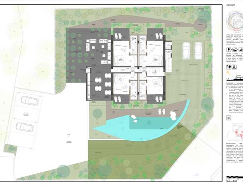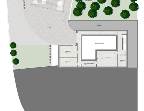 The structure will be open mainly during the summer period, but there is a desire to make it usable even in the winter period. The area already has a large underground storage room with provisions for utilities (including a pool technical room). It also has a parking area with a photovoltaic system and charging stations.