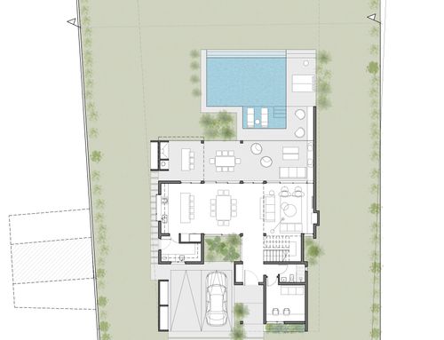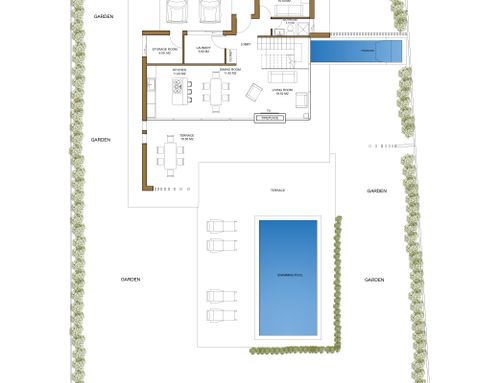 The front of the house that will face the street will be used as a pedestrian entrance / driveway with a low wall at the border that will be created, while the back of the house will overlook the private part of the garden with patio and swimming pool.