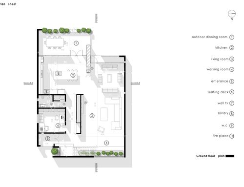 In the living room we would like a window to slide inside the wall or flush with the wall so there will be a continuity between the inside of the house and the outside; immediately outside, create a patio dining area with outdoor kitchen and wood-burning barbecue.