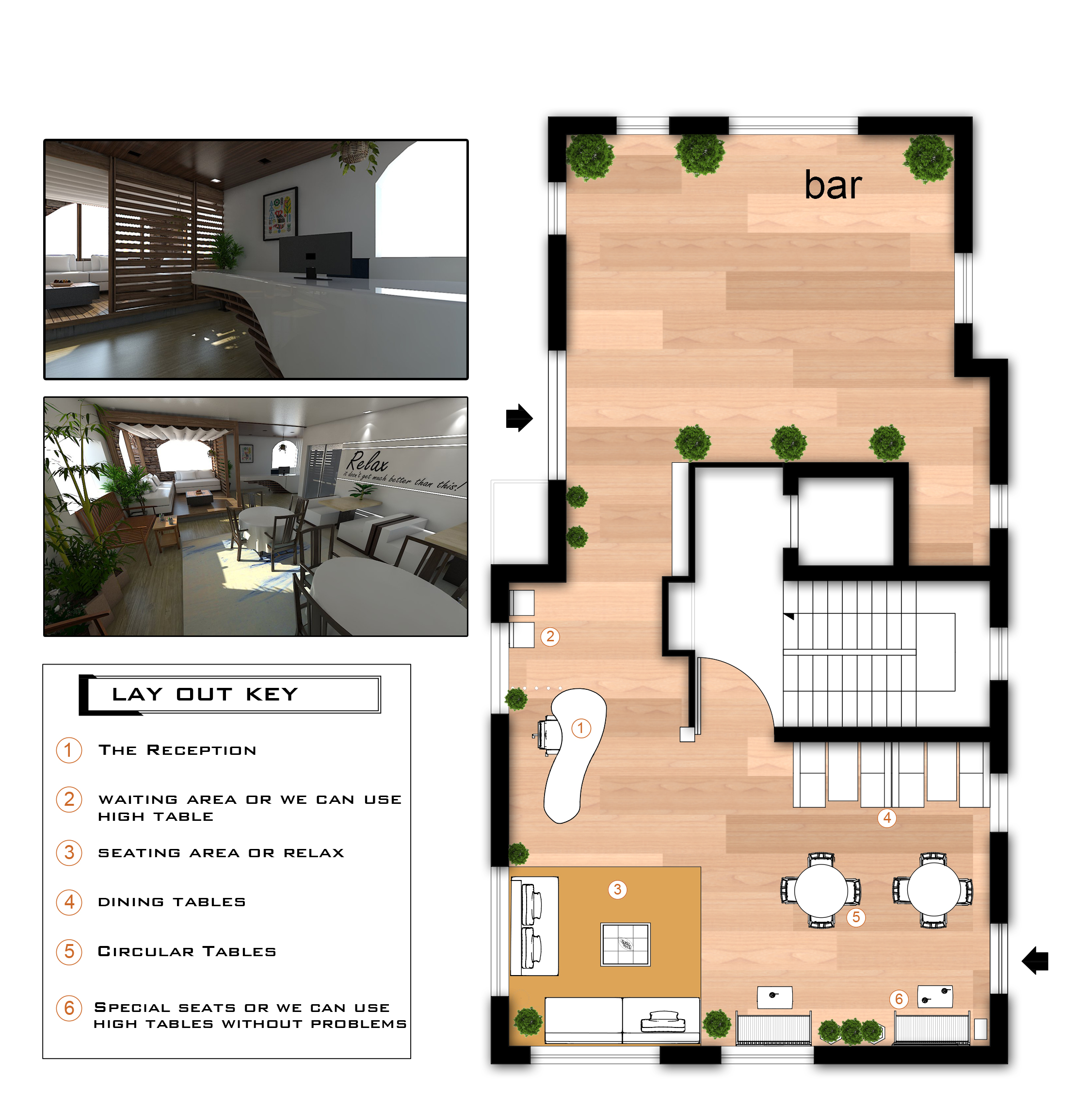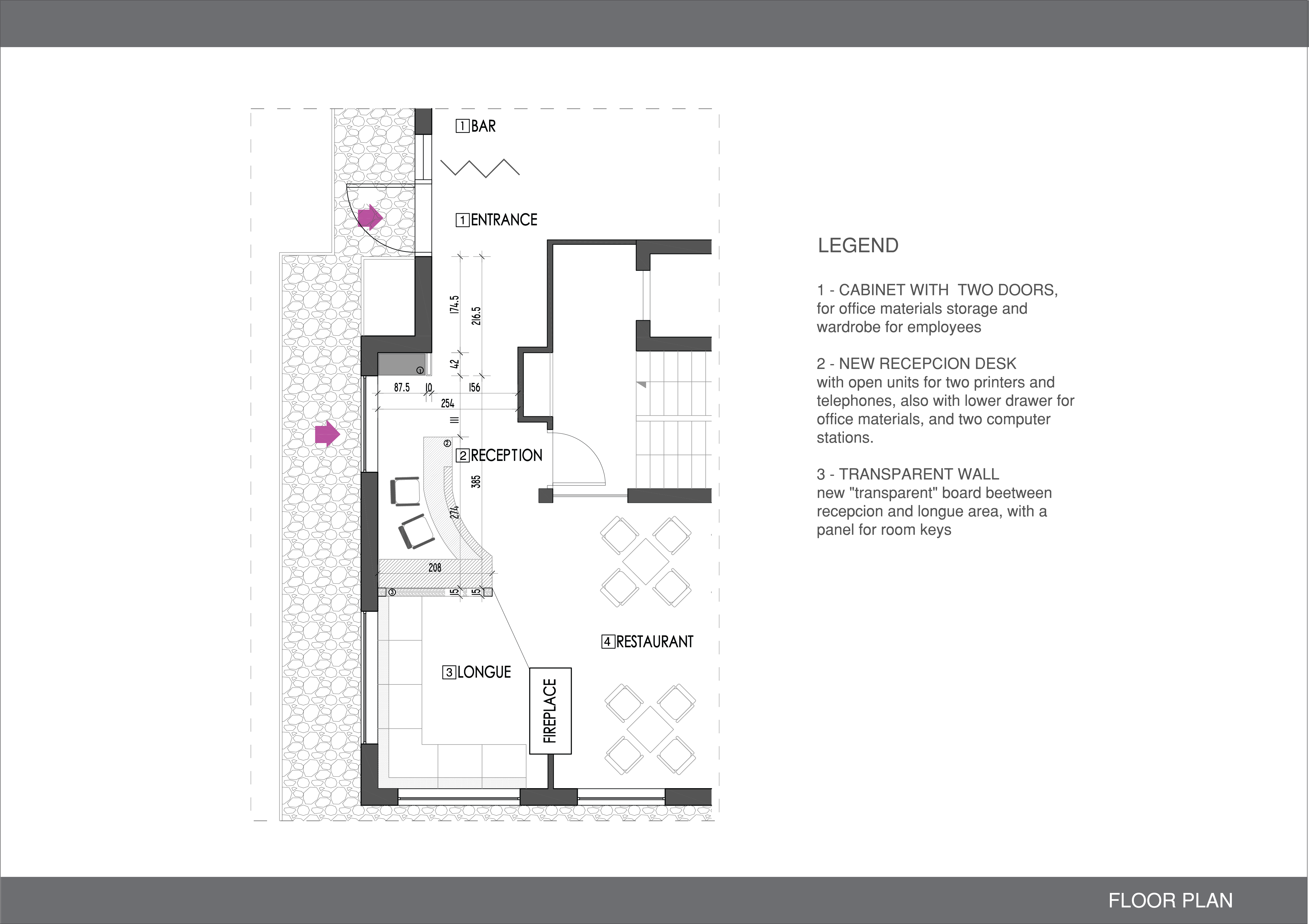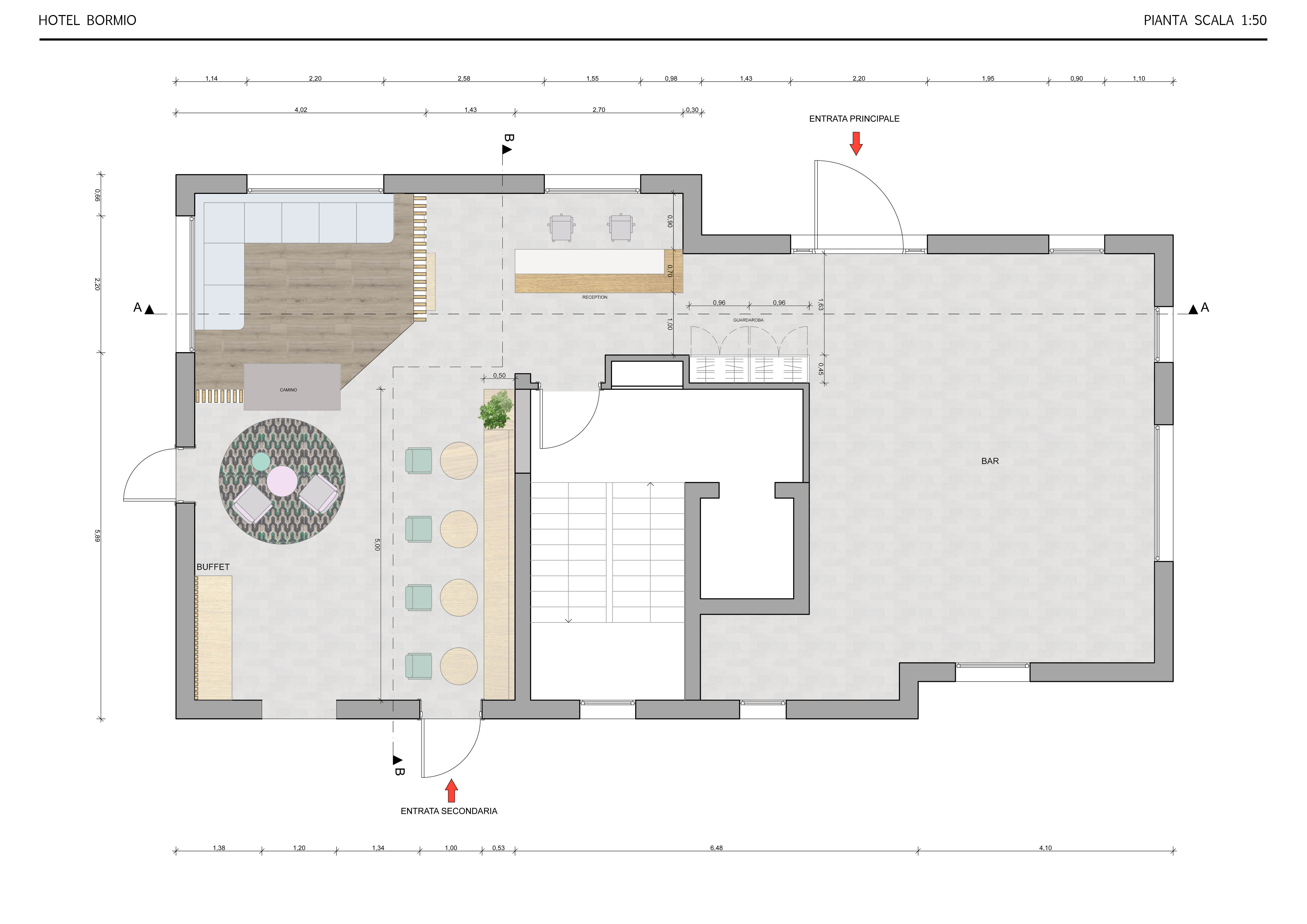 Premesso che non abbiamo molto spazio e inizialmente era stato pensato in quella posizione perchè di fronte a una porta che avrebbe dovuto essere l'entrata dell'albergo invece non essendo utilizzata dai clienti l'abbiamo chiusa posizionando un tavolo con panca ( per avere più posti a sedere). Partendo dal presupposto che il desk dovrebbe essere la prima cosa che il cliente vede entrando dalla porta, purtroppo non posso posizionarlo proprio davanti alla porta d'entrata in quanto si trova il bar, ho pensato di utilizzare quello che sembra un corridoio e attualmente si trovano 3 tavoli alti, per la nuova postazione della reception. E nello spazione che si libera posizionare altri tavoli da utilizzare per la sala o per il relax
