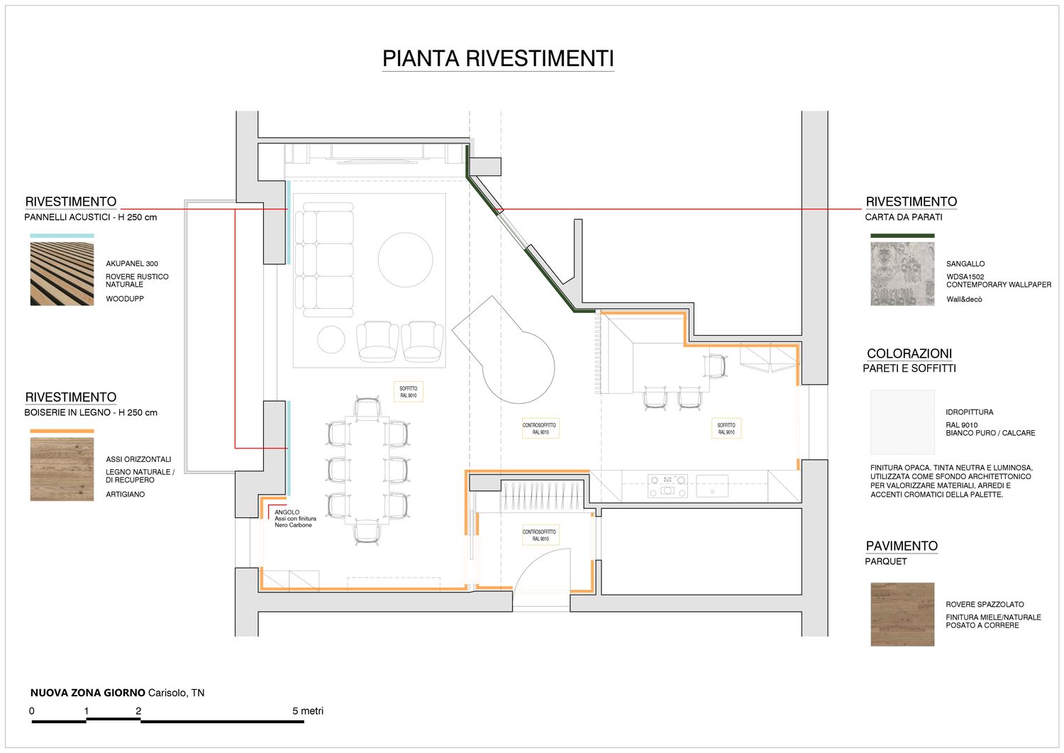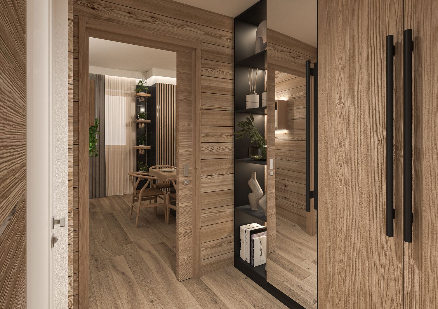L'atmosfera è definita da un sofisticato dualismo materico: il calore del Rovere rustico e delle grandi plance a parete si contrappone alla plasticità degli accenti colore Grigio Nerastro, scelti per dare profondità alle nicchie e vigore architettonico ai volumi.