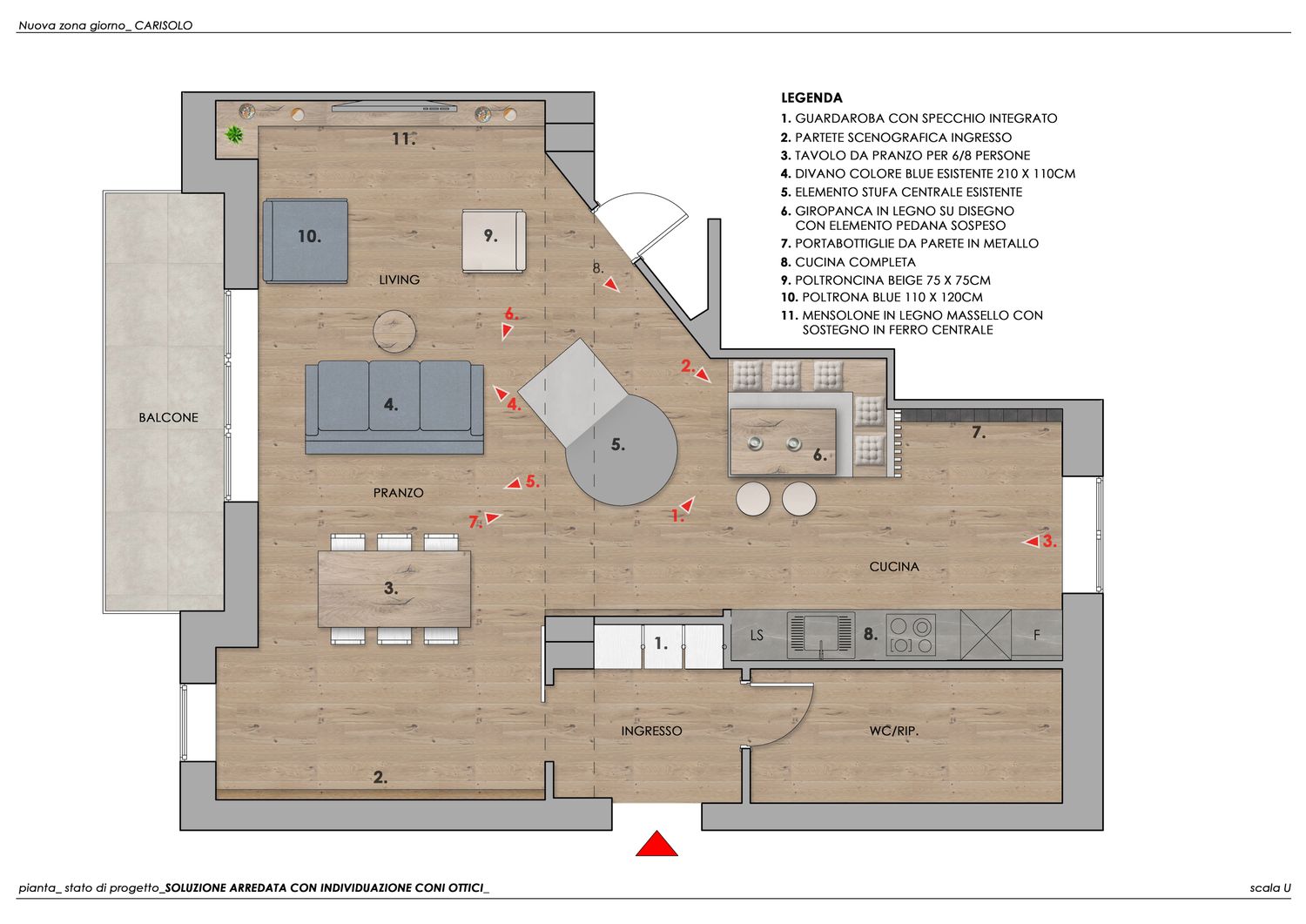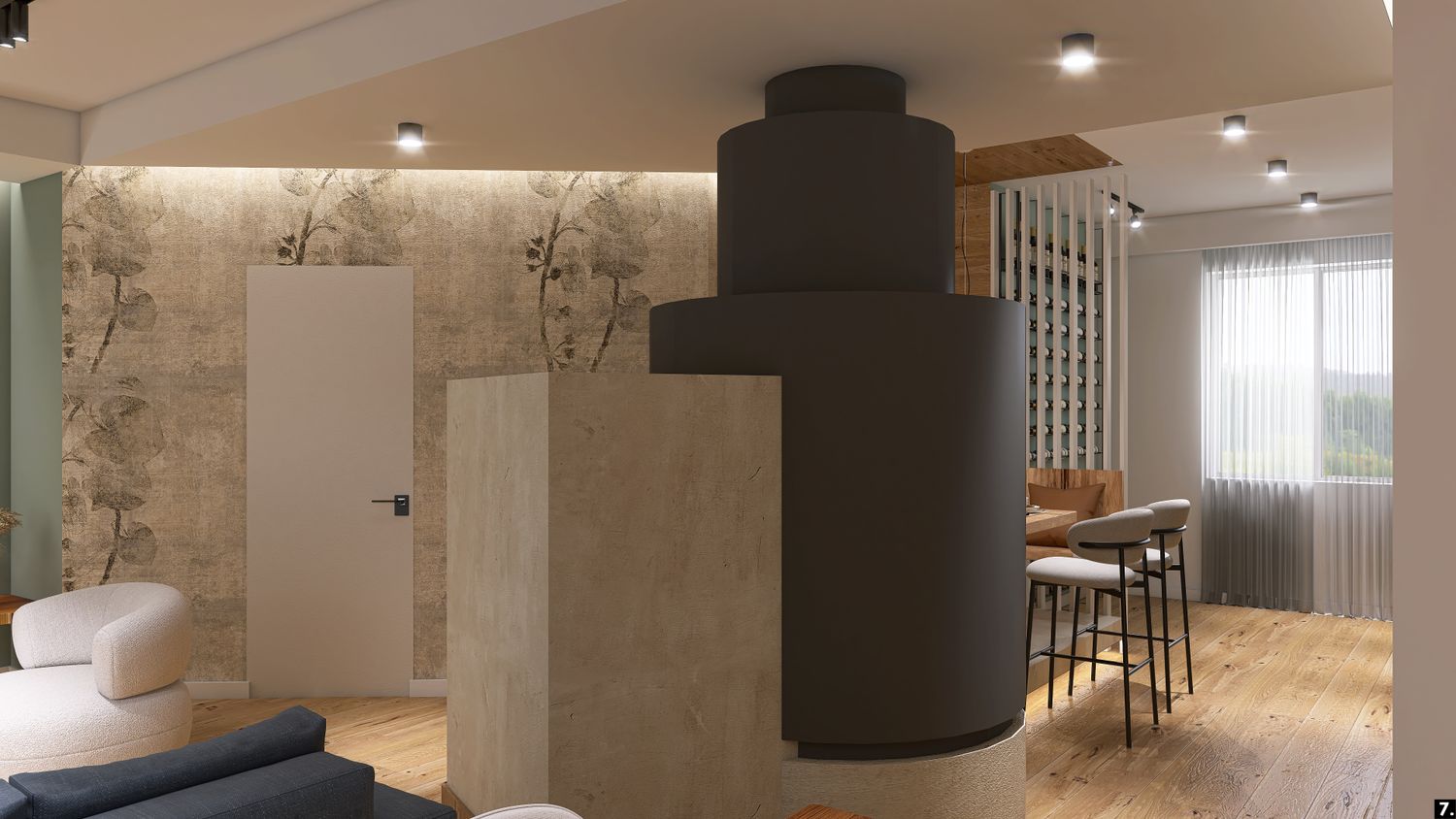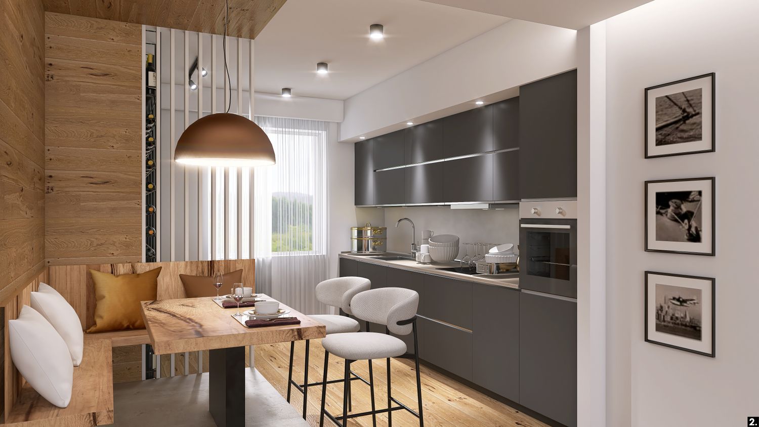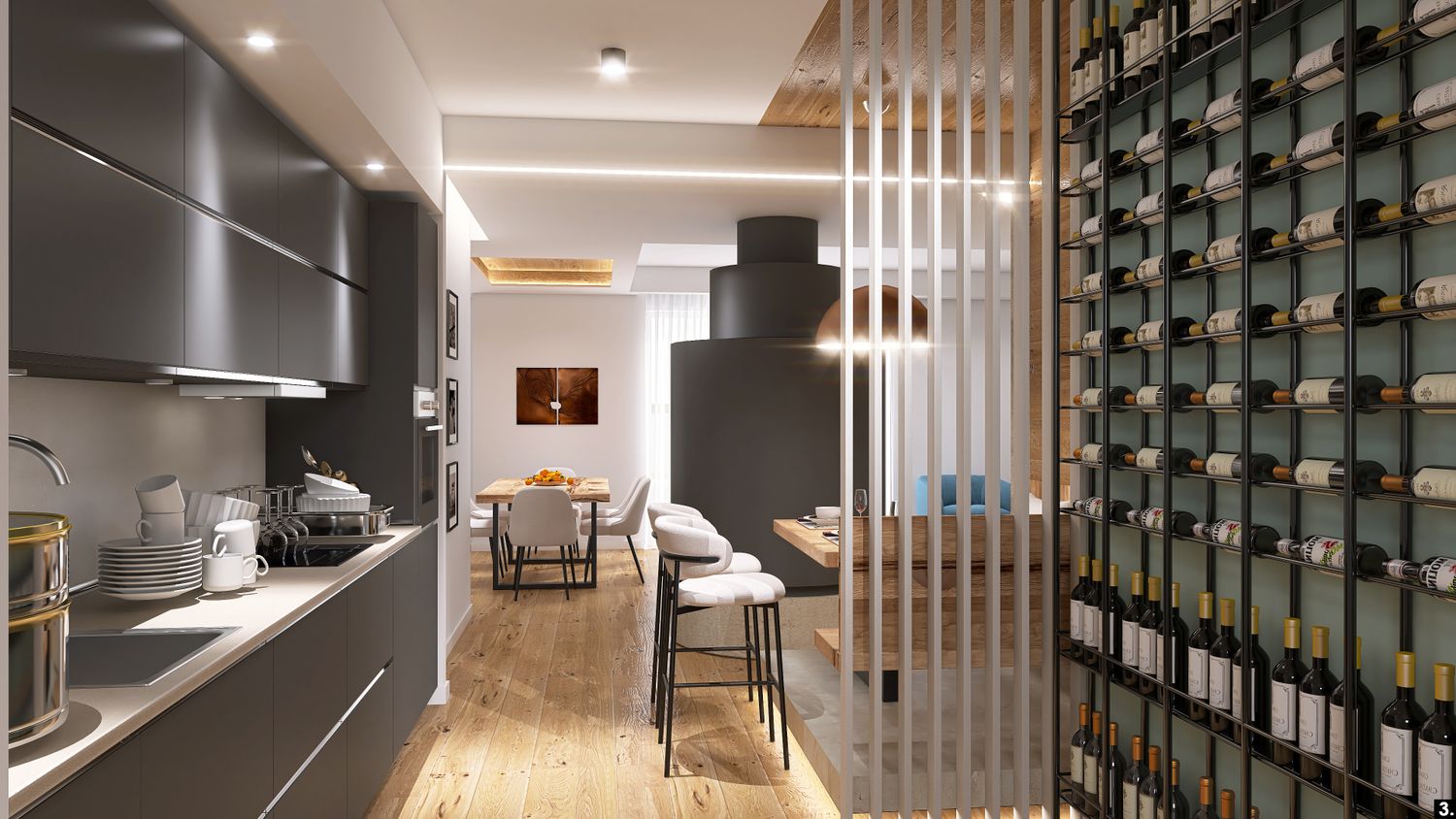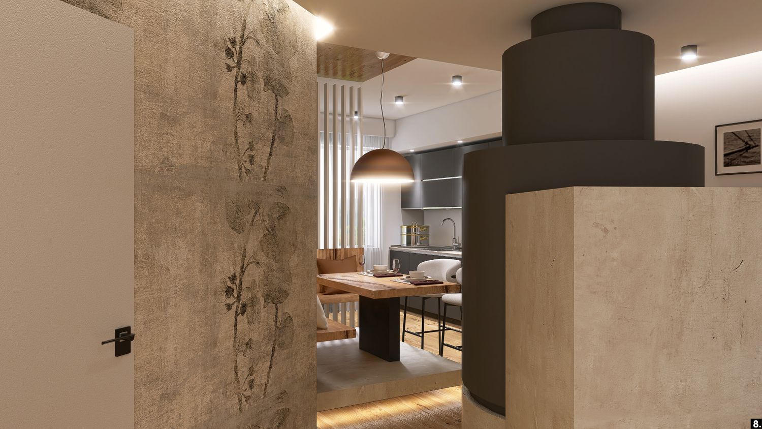 Il layout è pensato per favorire la condivisione e il calore della vita quotidiana, mentre i materiali diventano veri protagonisti emotivi dell’ambiente.