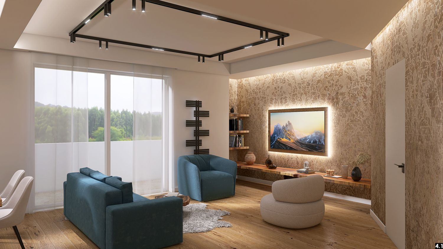 Il parquet in rovere naturale, dal carattere rustico e autentico, avvolge lo spazio con una sensazione di calore e continuitĂ , richiamando immediatamente la materia viva della montagna. Le carte da parati effetto damascato aggiungono profonditĂ e raffinatezza, creando un delicato contrasto tra eleganza e tradizione.