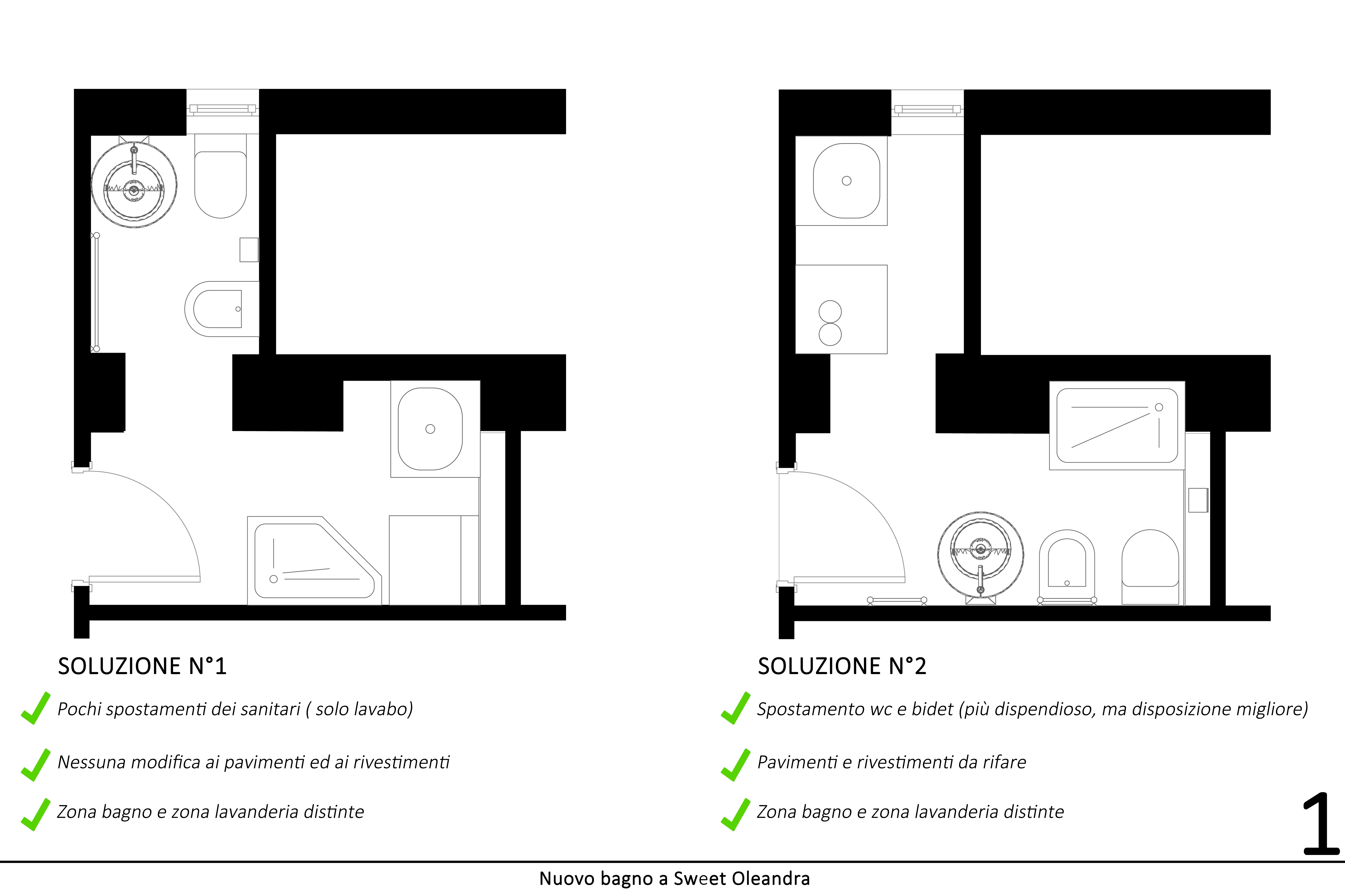 Ciao! Ci piacerebbe ottenere una zona lavanderia, dove poter inserire una lavatrice, un'asciugatrice ed eventualmente una lavabo/lavatoio rinunciando alla vasca da bagno ed in generale vorremmo una maggiore ottimizzazione degli spazi del bagno. Non vorremmo rinunciare al nostro bel lavabo di Philippe Stark e ai rivestimenti in mosaico, almeno nella zona "principale" del bagno.