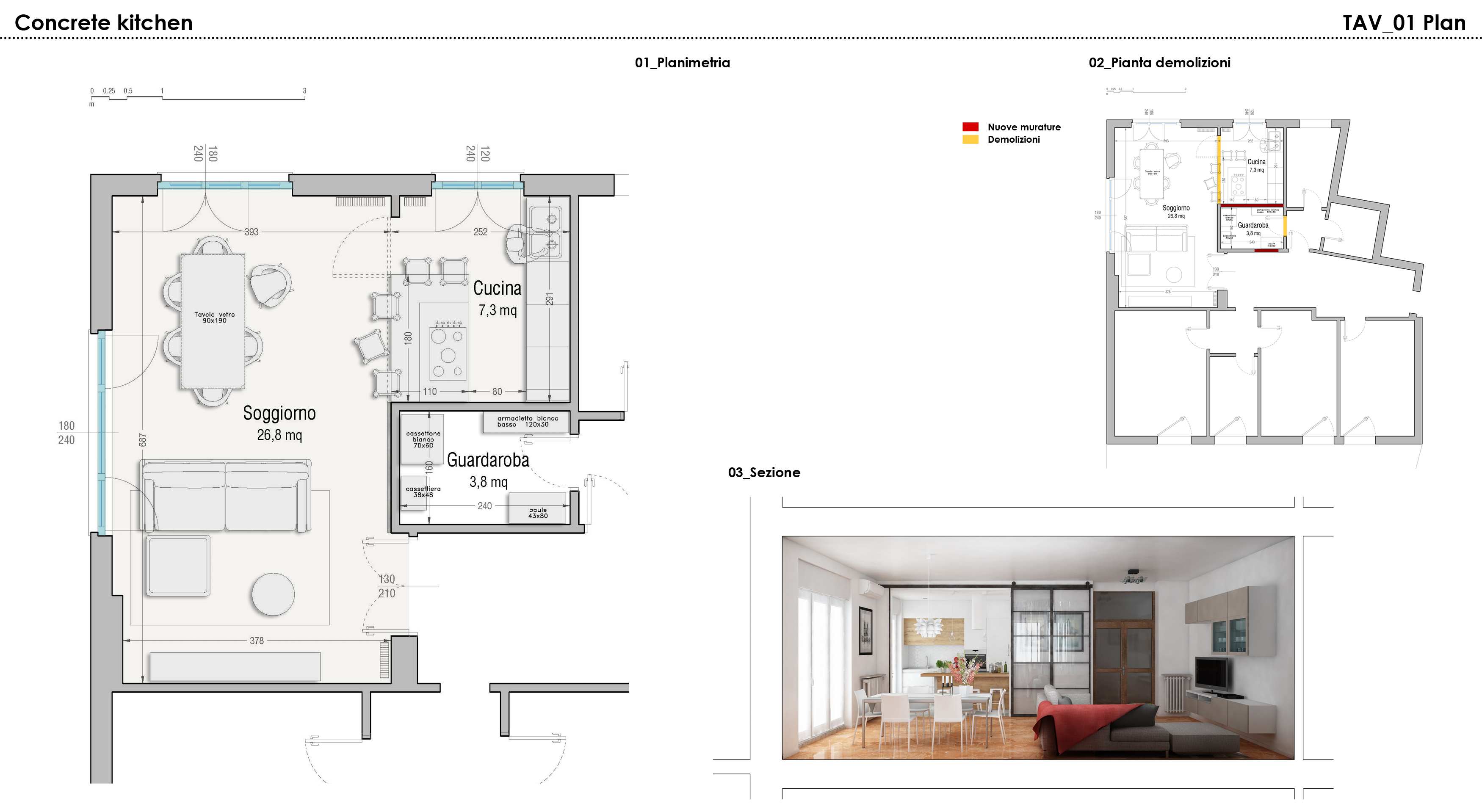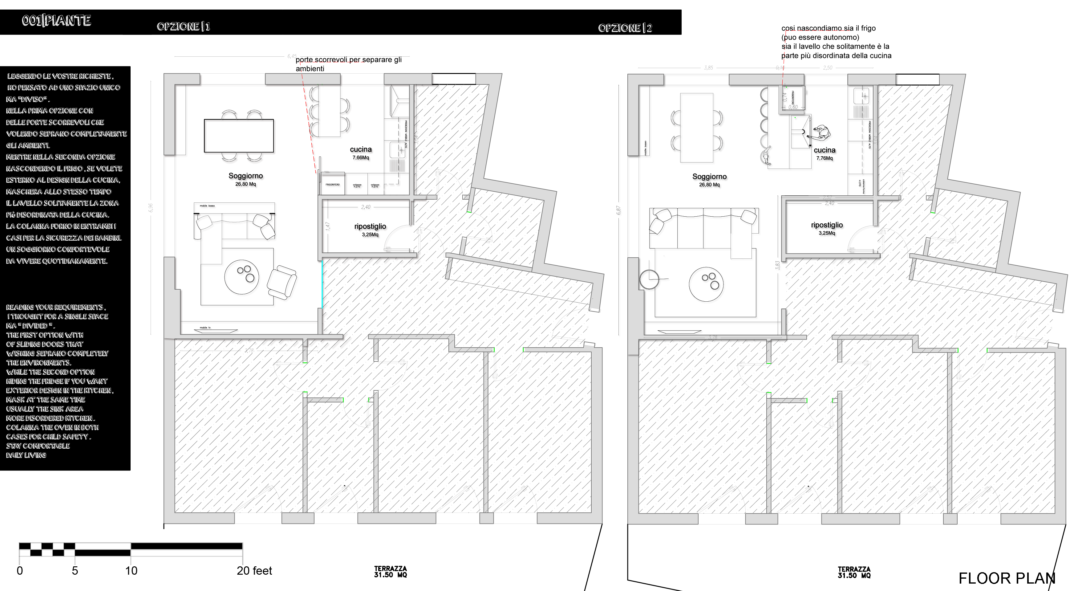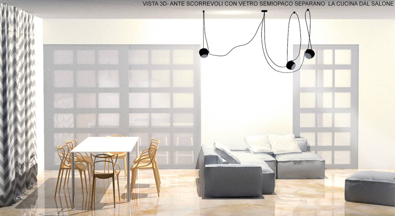 Di conseguenza aprire totalmente o parzialmente la restante parete che divide la cucina dalla sala.La pavimentazione in marmo della sala va tenuta e smantellata totalmente quella della cucina.Ci piacerebbe un isola con 5 posti a sedere e piano cottura ad induzione sull'isola. Nella sala dobbiamo posizionare un tavolo 190x90.