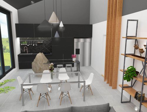 I love a modern minimalist style with industrial trends. I would like to build a mezzanine preferably above the kitchen area of 20-25 square meters for study-relaxation use. In the open space below I would like to create a kitchen area with island, living area with generously sized table and seating area with TV. I would like the mezzanine to be at a height of at least 250-260 cm. The house is under construction so I cannot upload realistic images. I can upload the dxf for the measurements and a pdf showing the house in orthogonal projection. The space I want to furnish is the ambiance of 10 x 5 meters: the height of this room is 3.98 meters above the windows and 5.98 meters on the right wall when entering. The measurements in the pdfs are not good because they have been modified with a variant to make it possible to create a mezzanine
