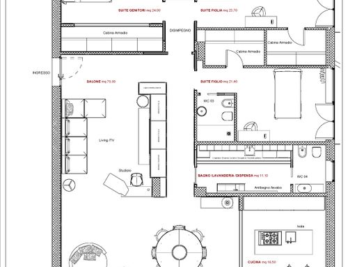 Ritenetevi liberi anche di proporre soluzioni che lascino inalterati i due bagni attuali(non più in camera), e aggiungano solo il 3 bagno nella camera da letto padronale.