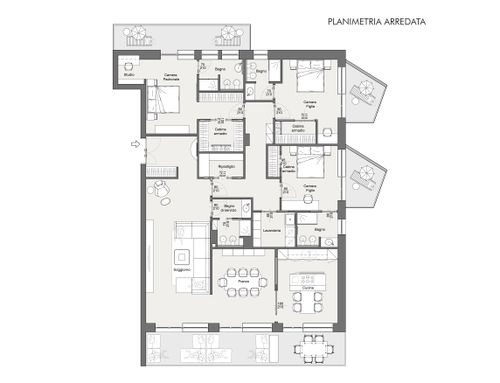 4 = Camera da letto mio figlio (19 anni richiesto bagno interno e cabina armadio) dotata di terrazzino autonomo.