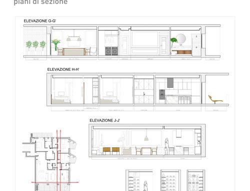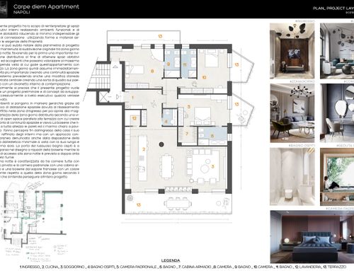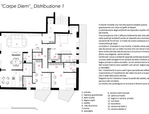 1 - Should become Kitchen with peninsula or island with suspended hood. It has views of the Gulf of Naples and must include a small dining area for daily use. The separation from the living room (2 + 3) should include a large sliding matte / satin door.