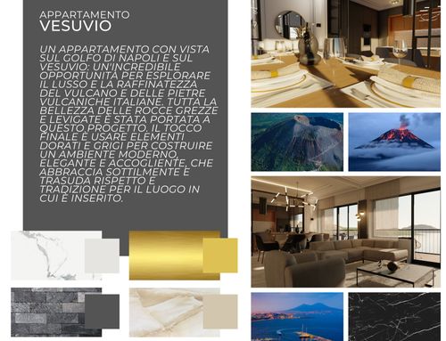 2+3 = Salone con vista (richiesto bagno di servizio ospiti). E’ dotato di ampio terrazzo per l’intera ampiezza e vogliamo valorizzare la vista sul Golfo di Napoli. Il terrazzo dovrebbe includere una piccola zona relax con divanetto e poltroncine.
