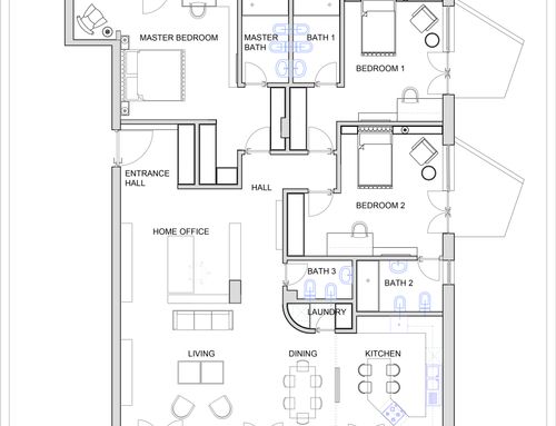 Feel free to also suggest solutions based on the two actual bathrooms (no longer in bedroom), plus the third bathroom for guests.