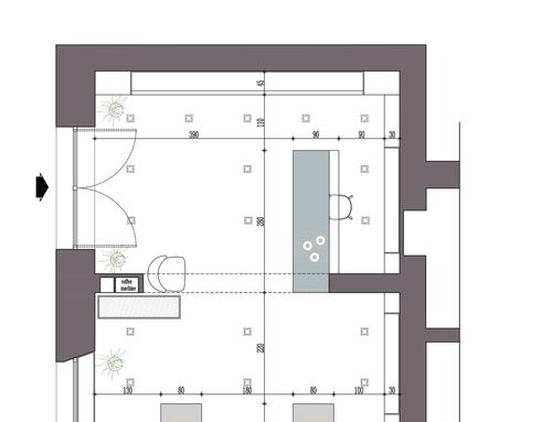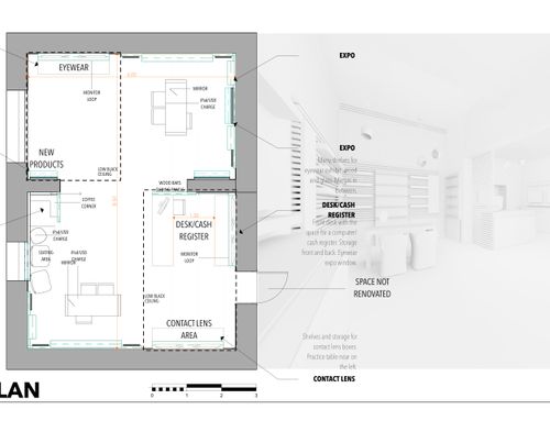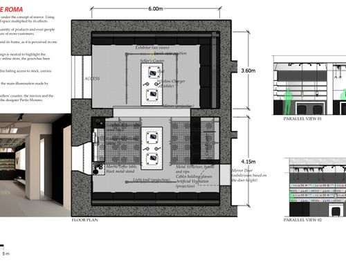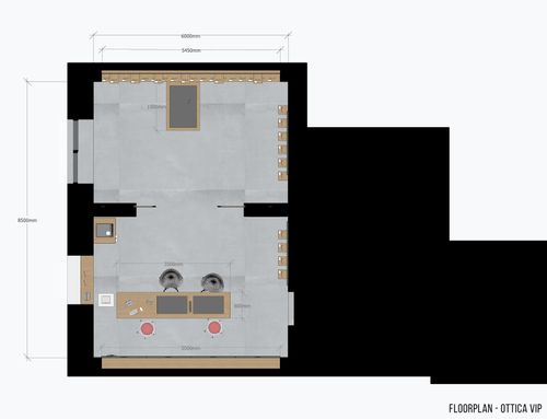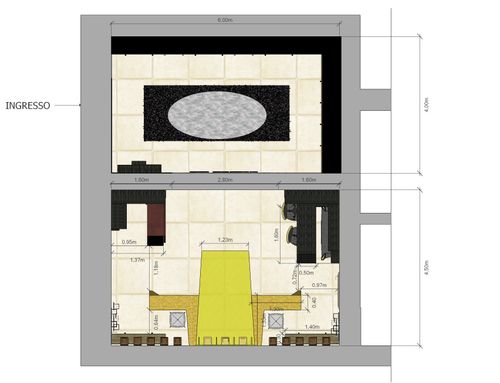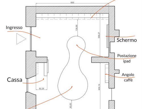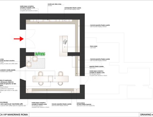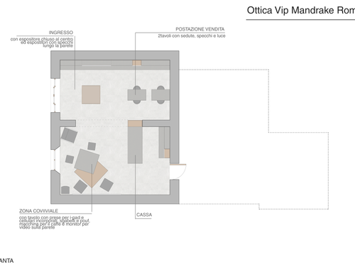 NEGOZIO FUNZIONALE PRATICO PARTICOLARE E ACCOGLIENTE E TRENDY, il contesto deve avere  desk,cassa,2 postazione vendita assistita con banco e relative sedute,specchi,tavolo pseudo conviviale con prese per ricarica cellulare e iPad e macchina caffe’ per i clienti,monitor per video a loop,LA PARTE DA PROGETTARE E' SOLO QUELLA ANTERIORE CHE SULLA PIANTINA HA IL COLORE DI BASE NERO