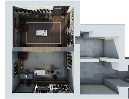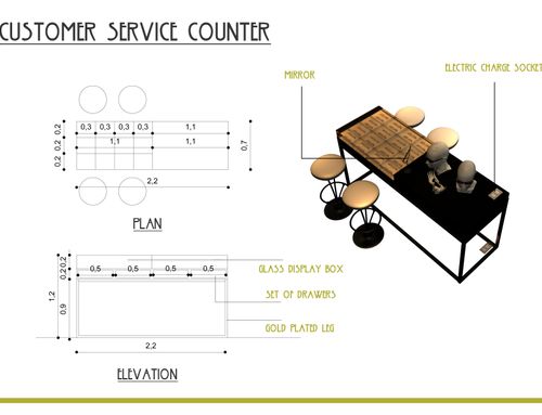 I’d like my shop to be both functional and peculiar, comfortable and trendy. I need desk, cash register plus two counters for the vendors. Each of them needs to have a place to sit for the client and a mirror. I’d also like the counters to have sockets for iPhone chargers. I also need to place a coffee machine for clients and monitors where to play video in loop.