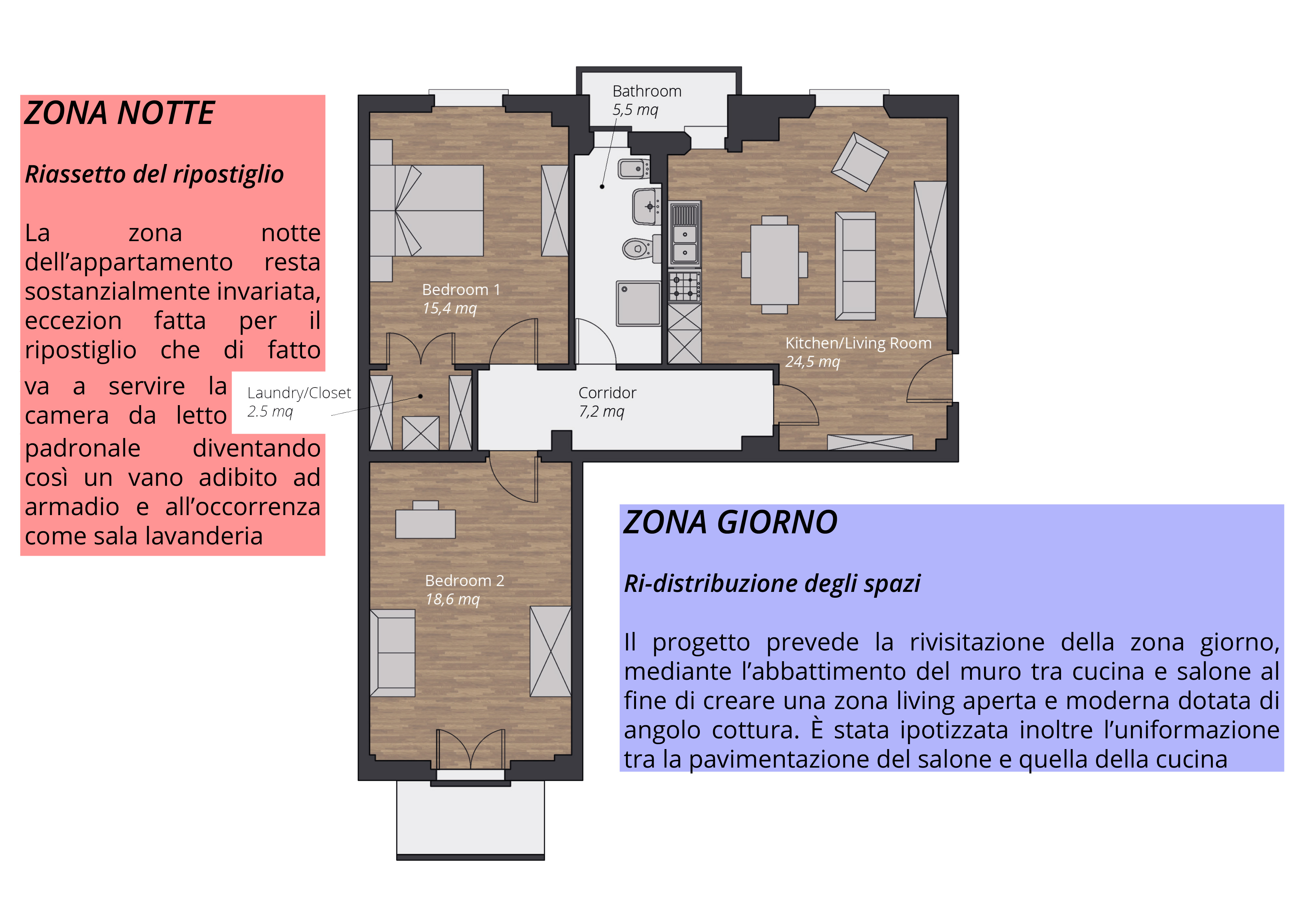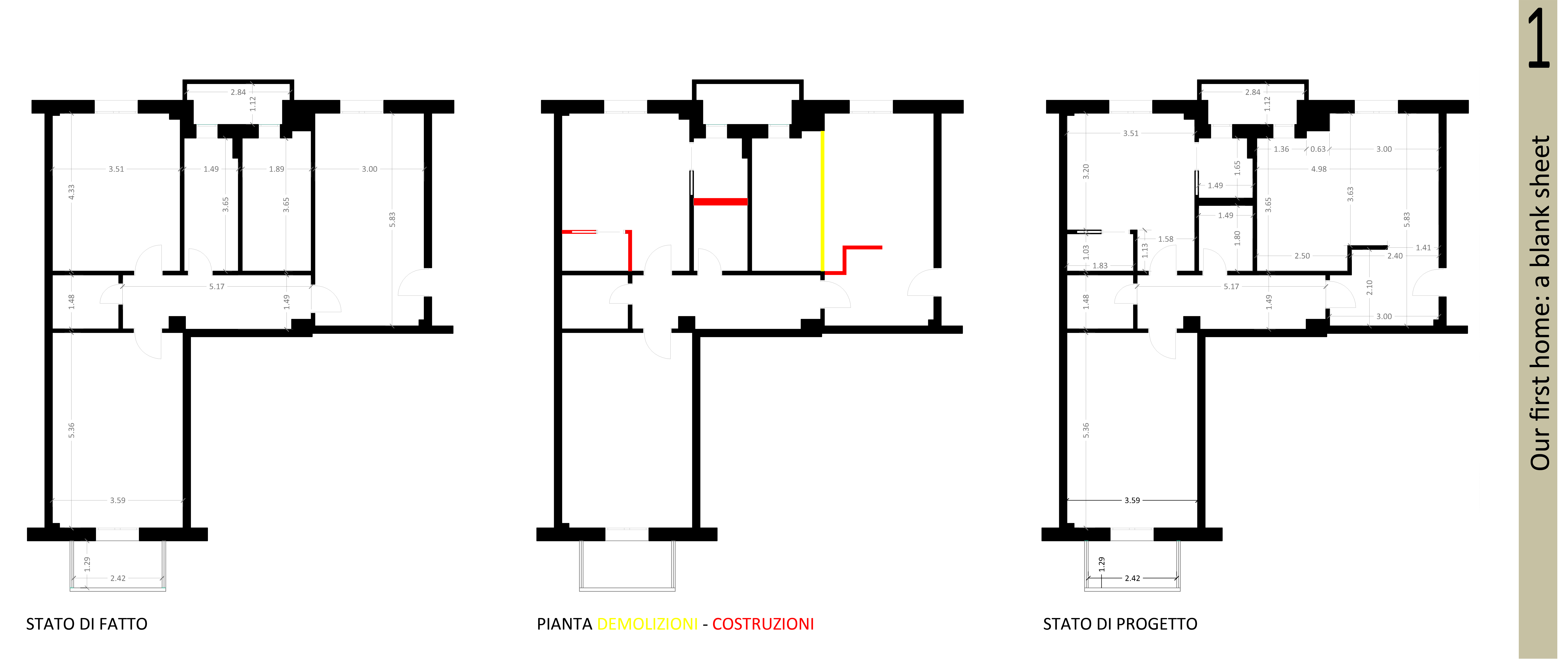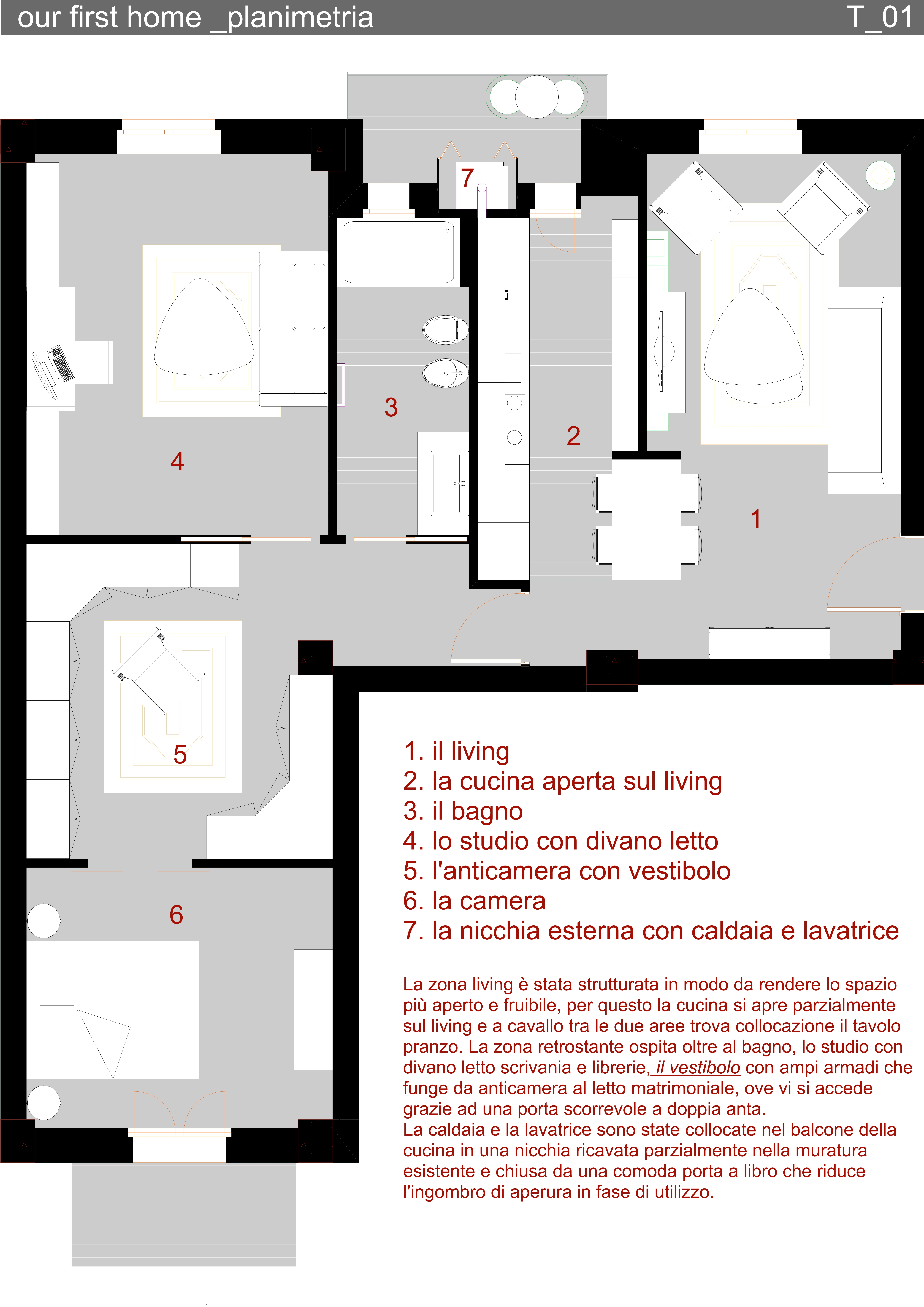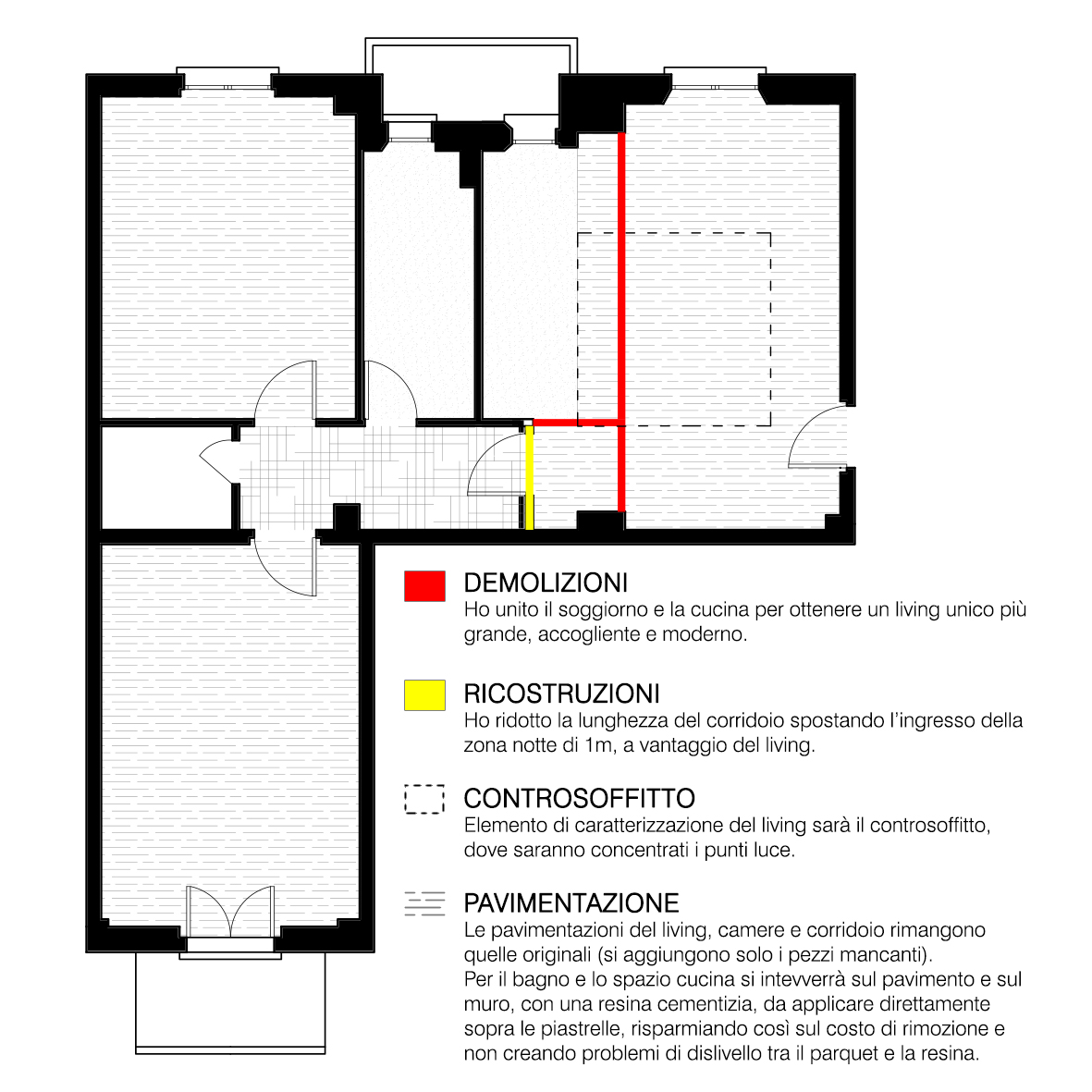 In sostanza sono da "rivedere"la sala, la cucina e le due stanze - soprattutto lo studio/camera degli ospiti - e, infine, il bagno (visti gli spazi, si potrebbe anche pensare di ricavare due bagni).
