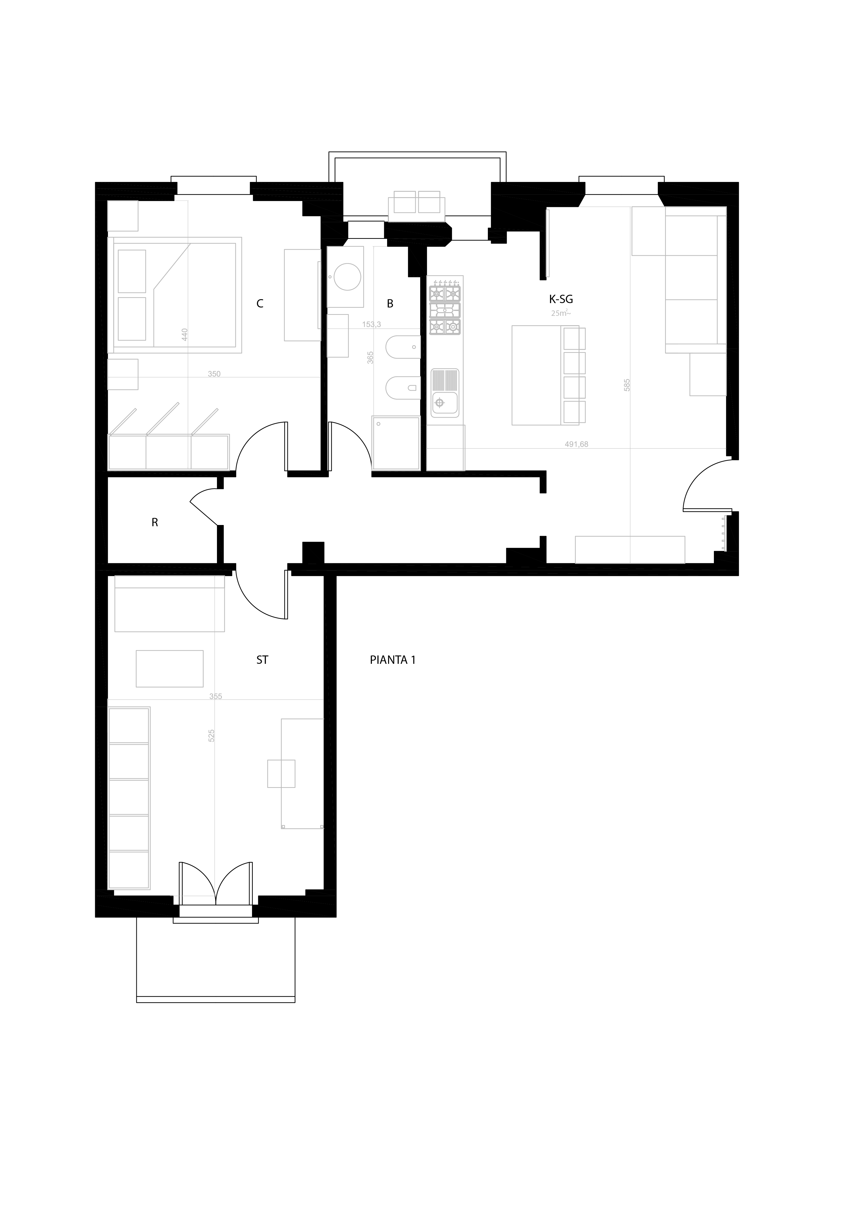 The current subdivision of the rooms is in general congenial for us. However, the living room (S in the map), is quite small. Then we are planning to connect the kitchen (K in the map) to the living room and we are considering at the moment three options: obtaining a sort of arch between the two rooms;  bringing down the entire wall; connecting the two areas with a high sliding door resembling a wall (the latter option could be practical in order to be able to open an extensible table between the kitchen and the living room and to completely separate the two areas closing the door).