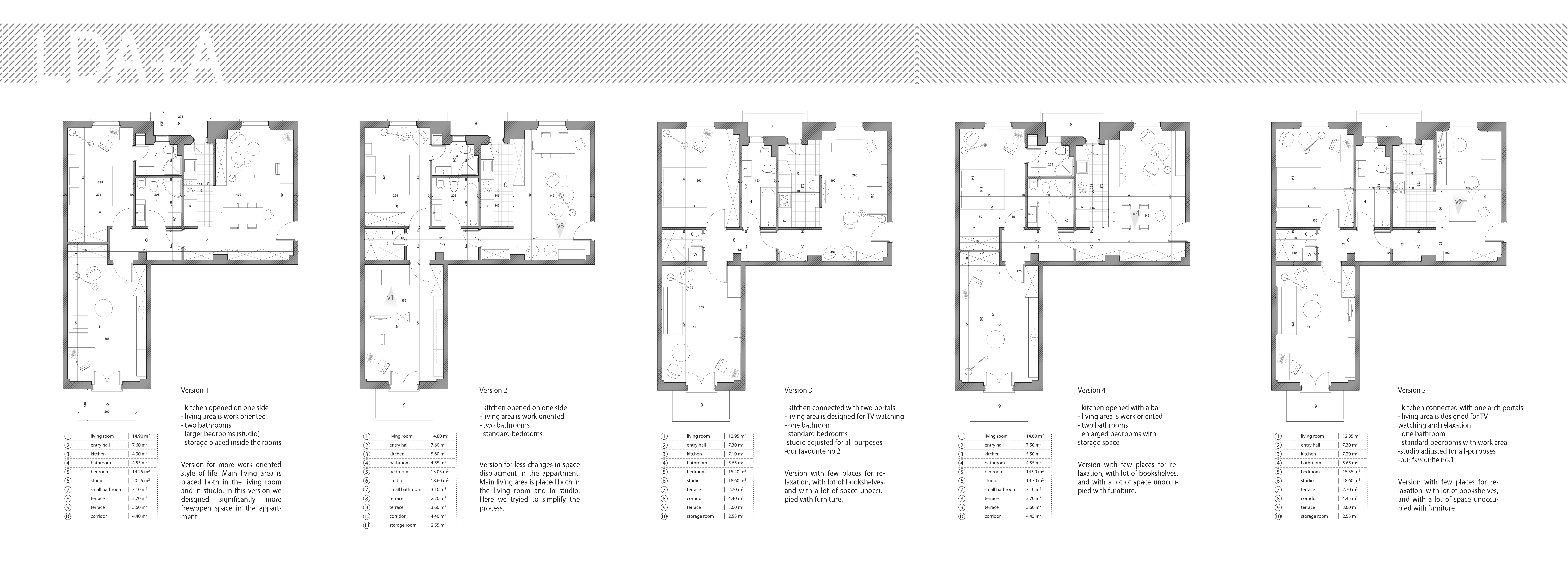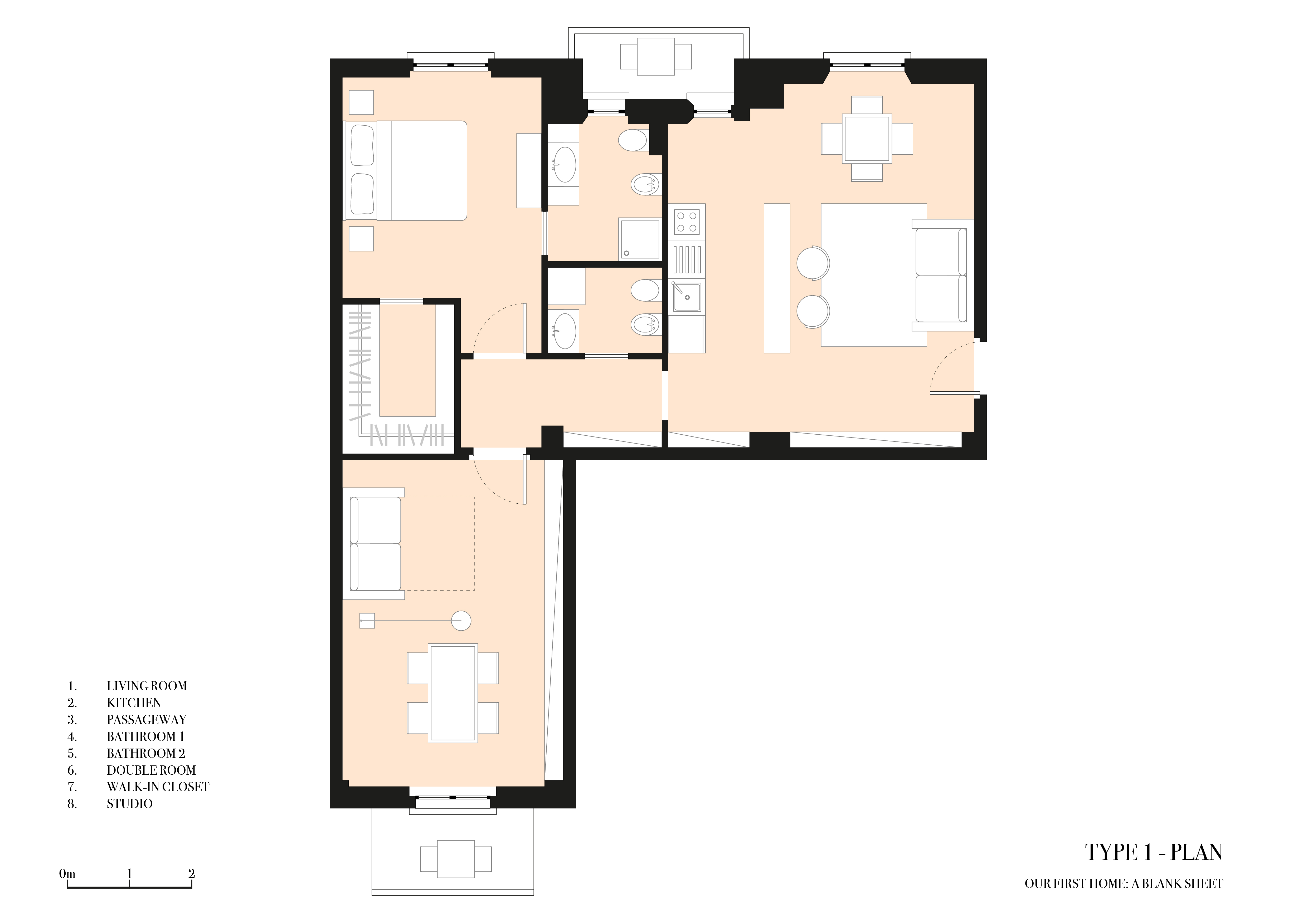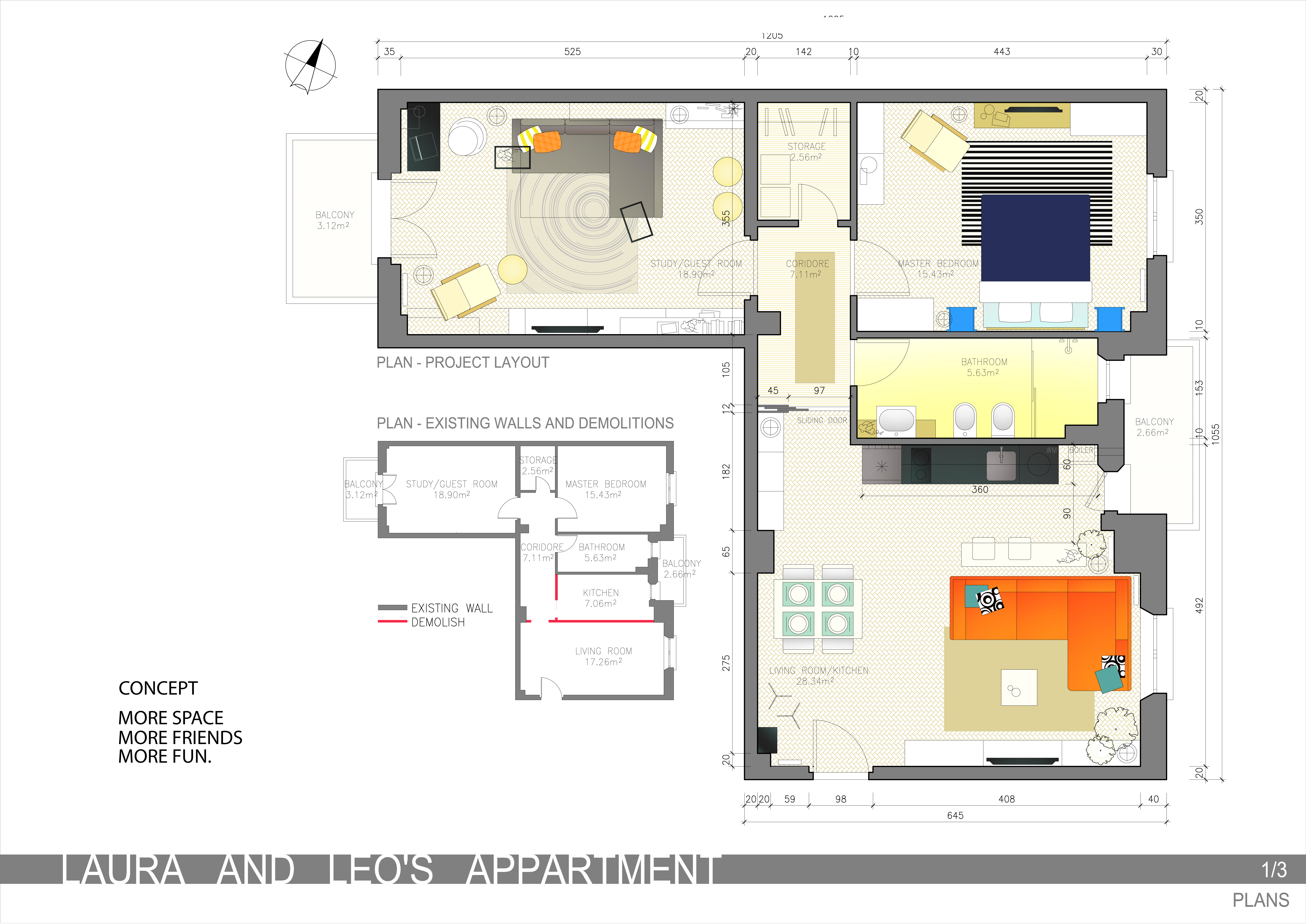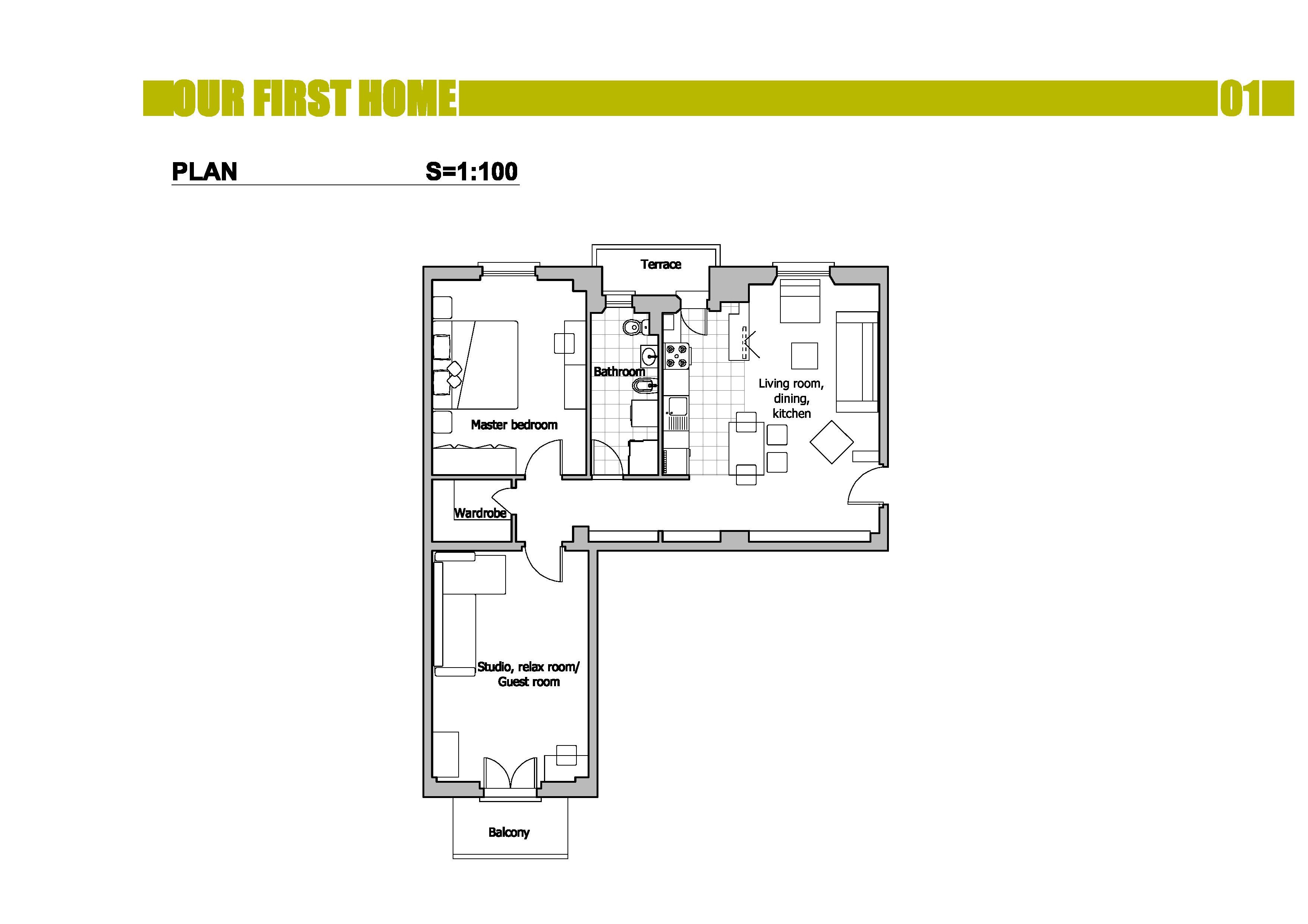 Our bedroom might be in the last room on the right (C in the map, without balcony) and we would like to get a kind of studio/relax room in the other room, that should also serve as guest bedroom.
