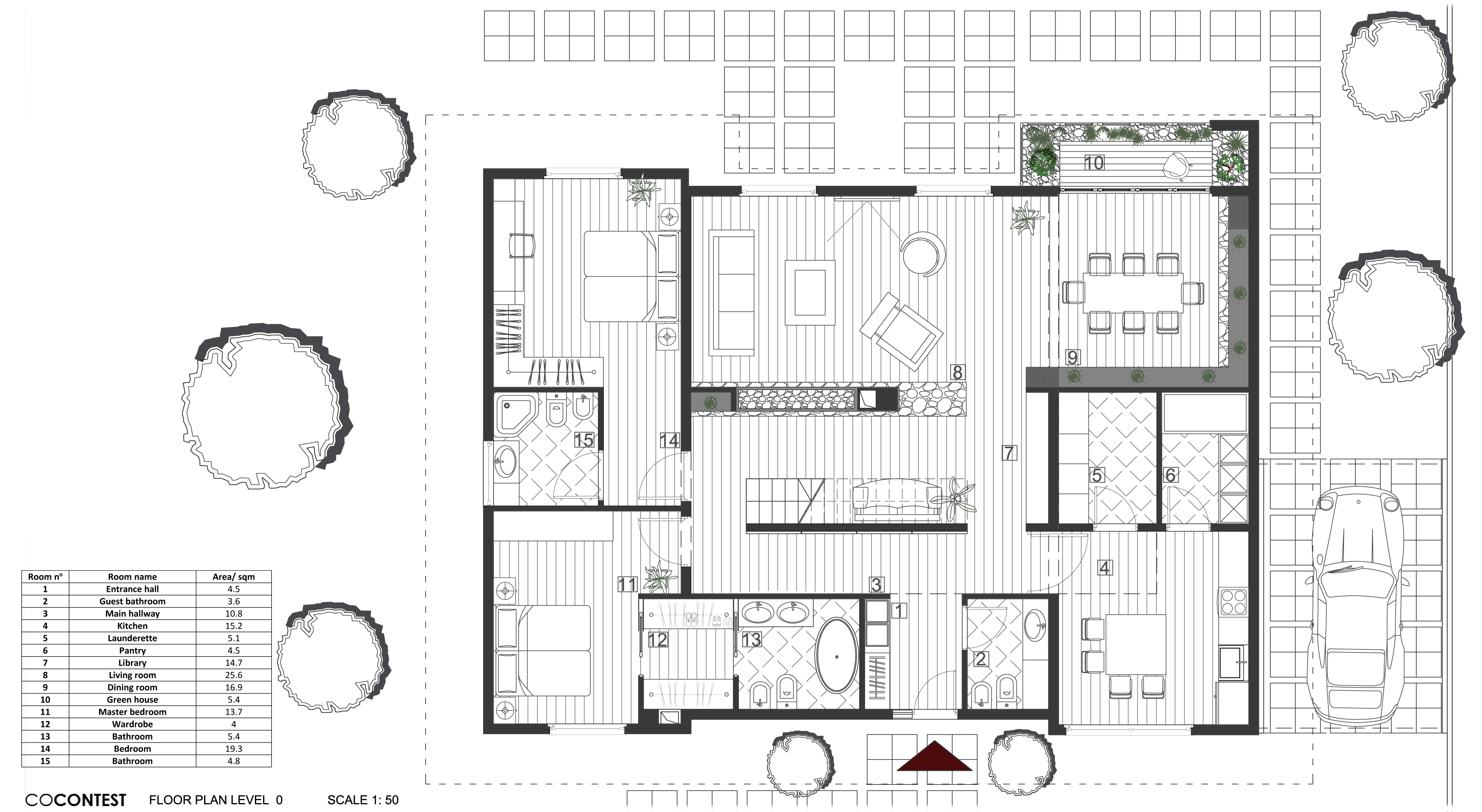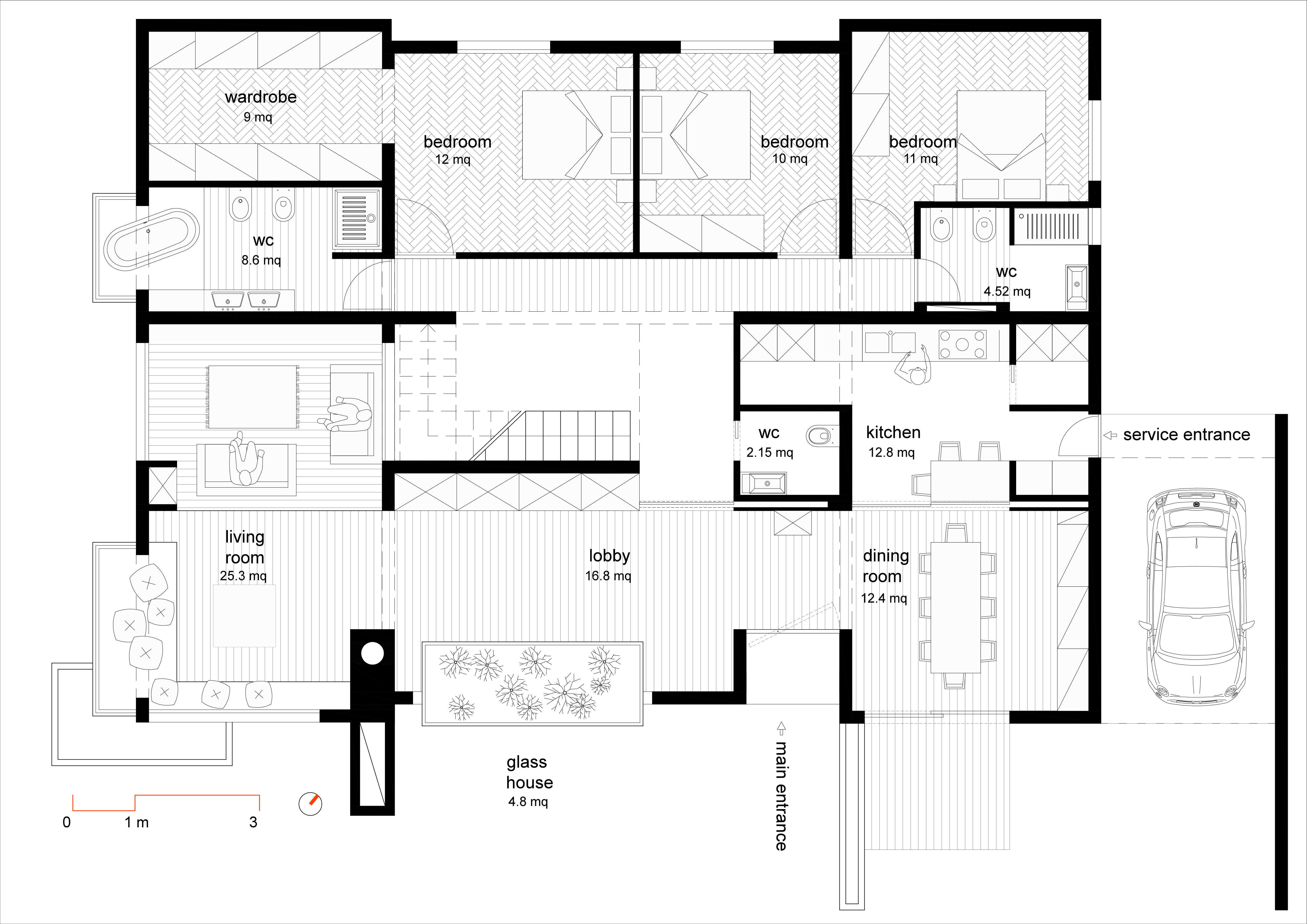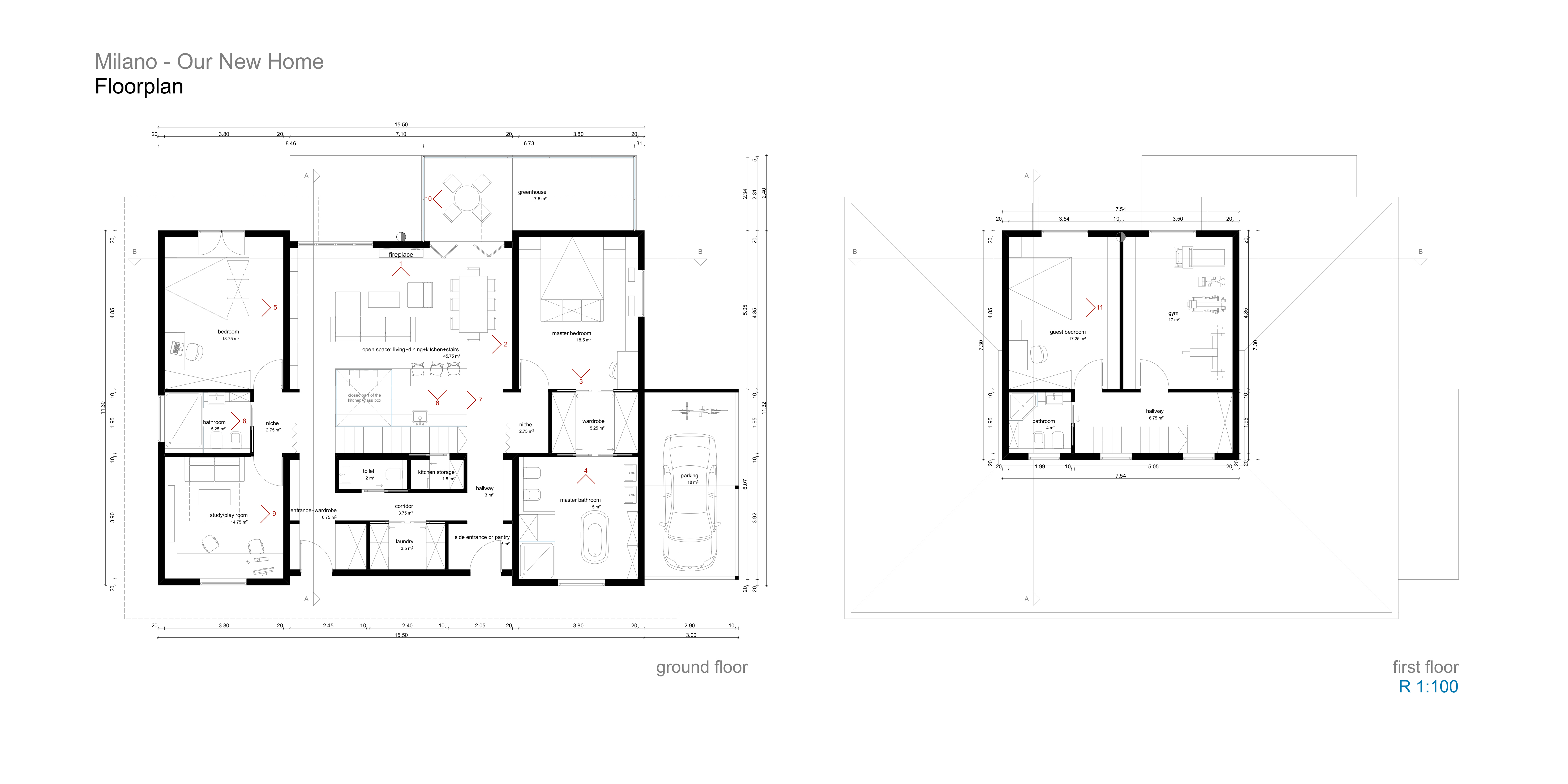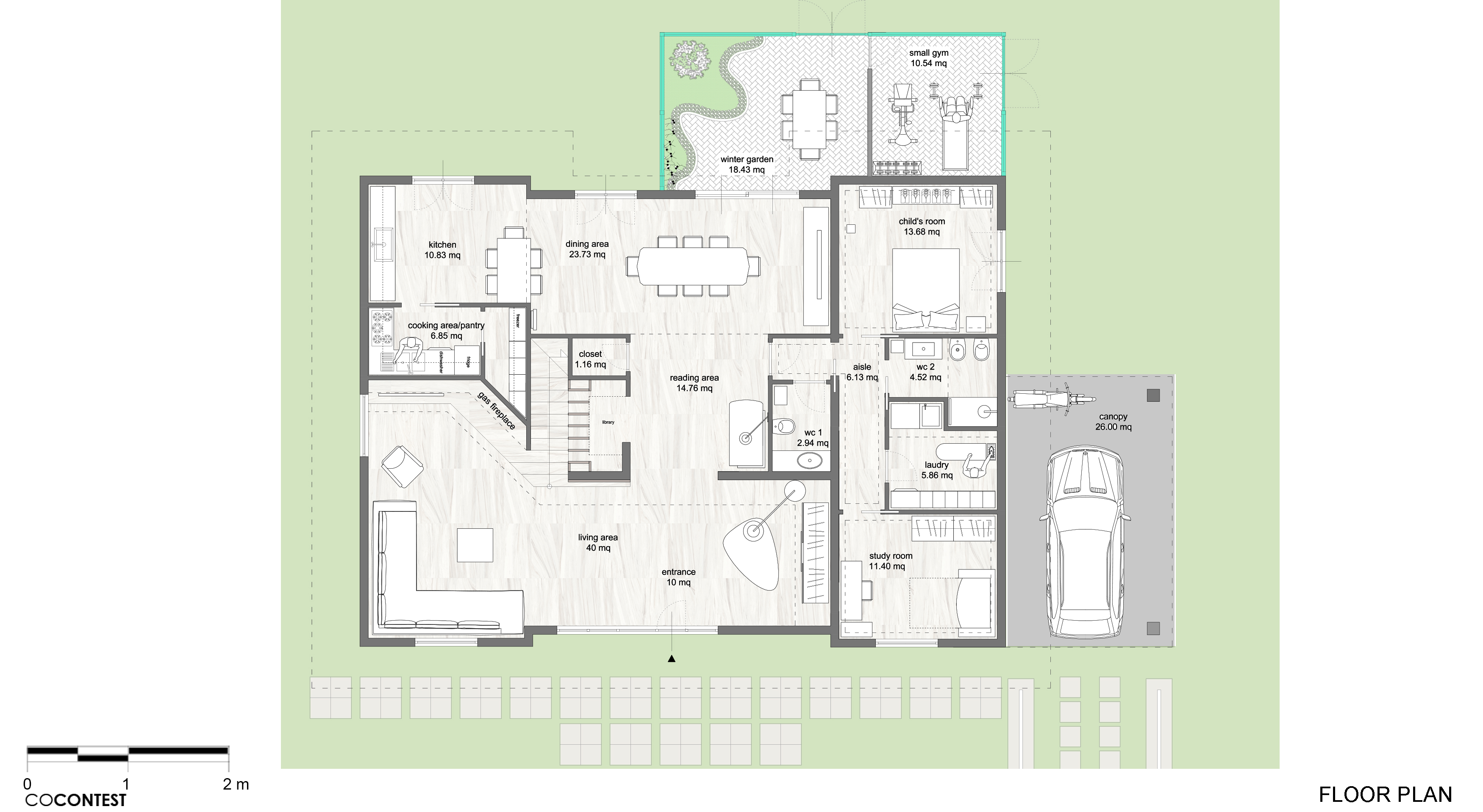 Stiamo considerando di aggiungere un serra/giardino d’inverno lungo la facciata nord (a partire dallo spigolo N / E). Essa può essere usato per una piccola area fitness e un piccolo tavolo (4 persone) per la cena estiva o uno spazio di conversazione. Dovra avere anche  uno spazio adibito a "giardino d'inverno", non di più 3-4 mq (vedi foto “green house”)