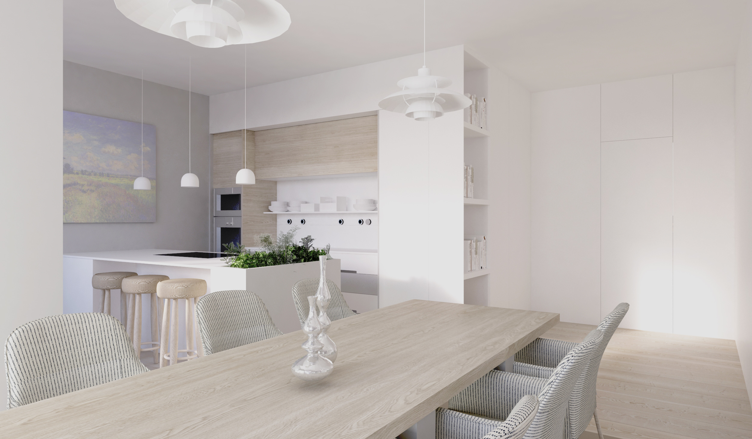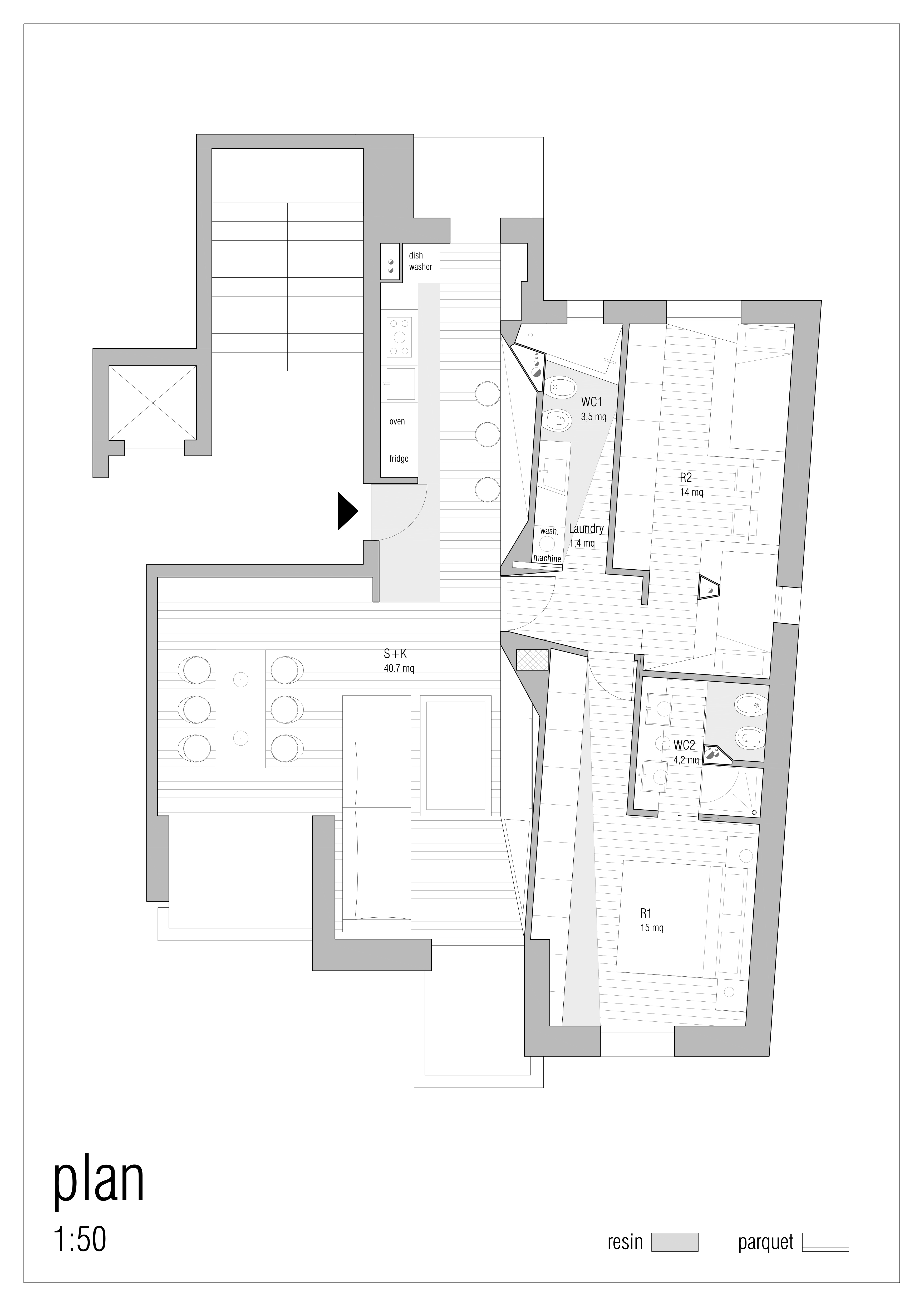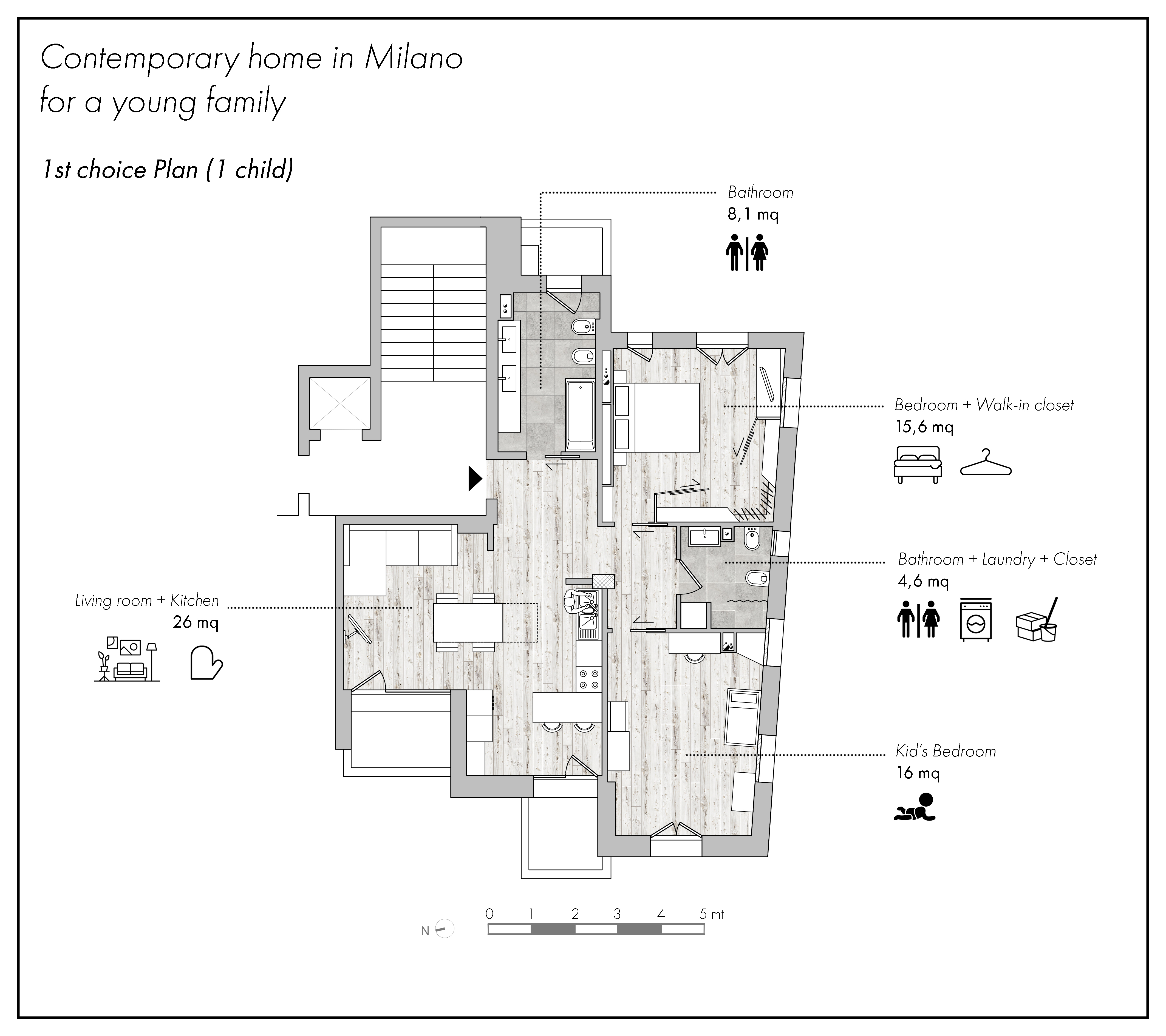 Vorremmo ristrutturare l'appartamento mantenendo le 2 camere da letto (una matrimoniale per me e mia moglie - magari con cabina armadio - e una doppia per ospitare in prospettiva 2 bambini), avendo 2 bagni, un piccolo locale ripostiglio/lavanderia, un soggiorno ampio e una cucina chiusa o a vista è indifferente (magari con isola o penisola). Non amiamo i corridoi, gli ingressi e gli spazi persi.
