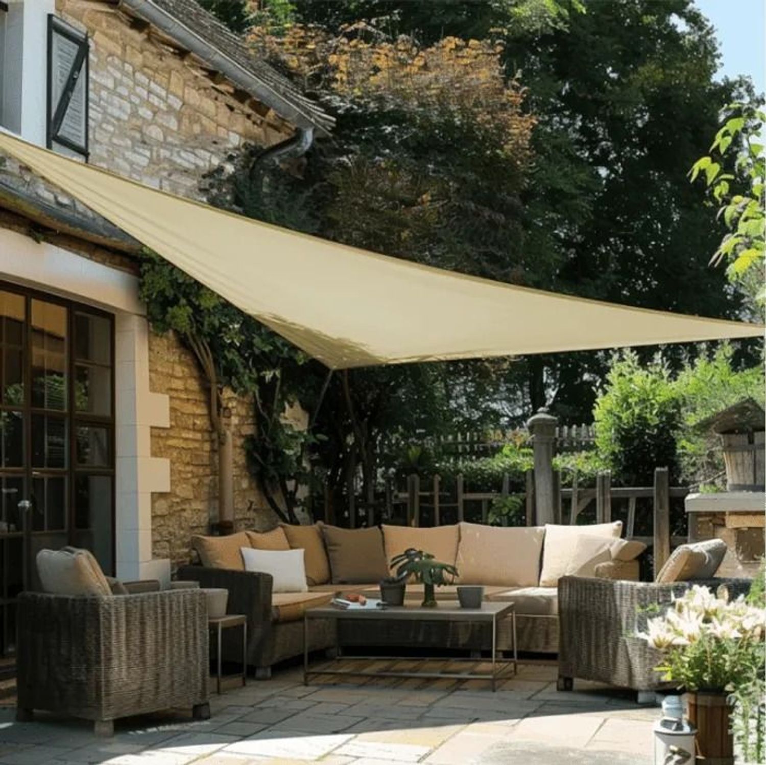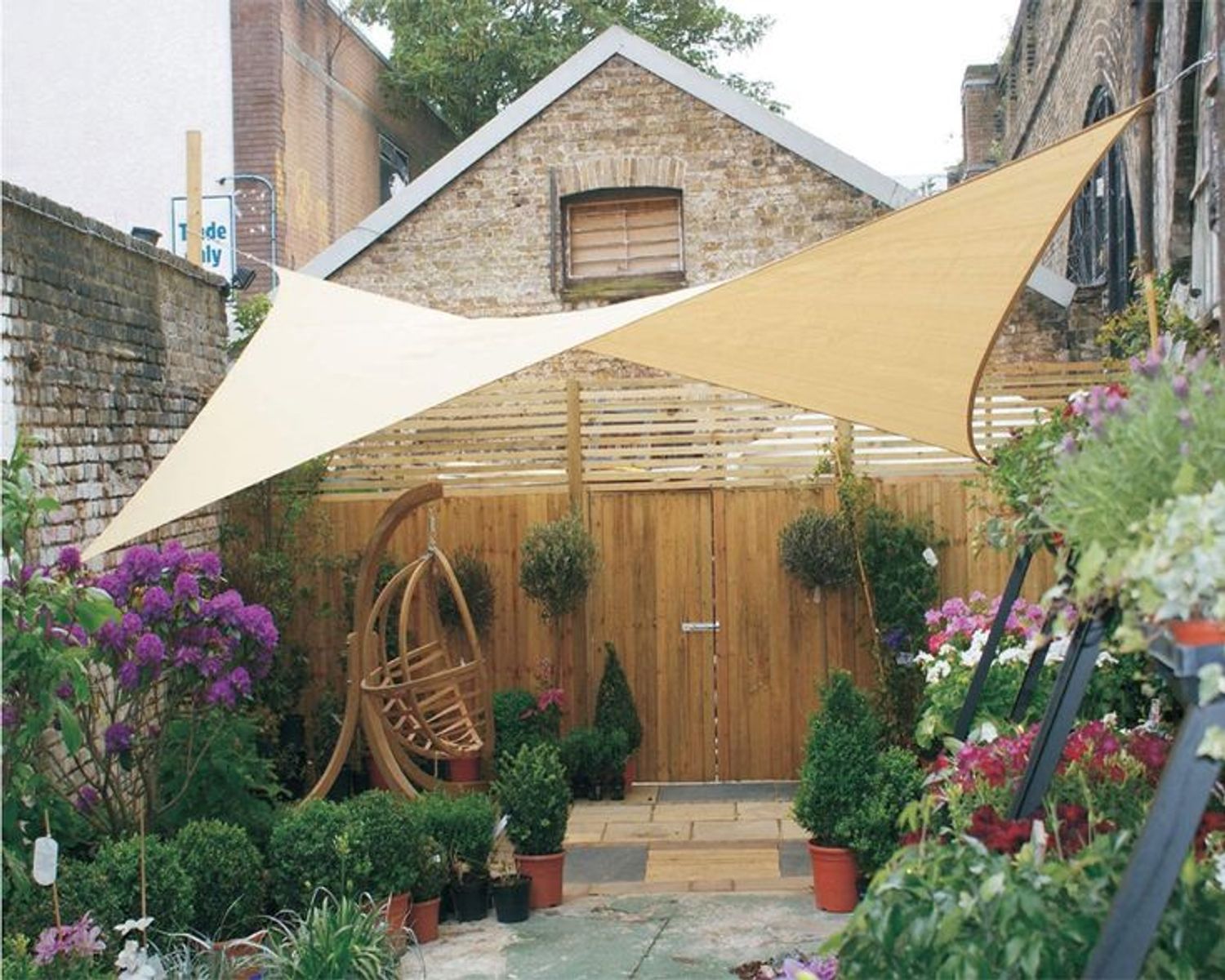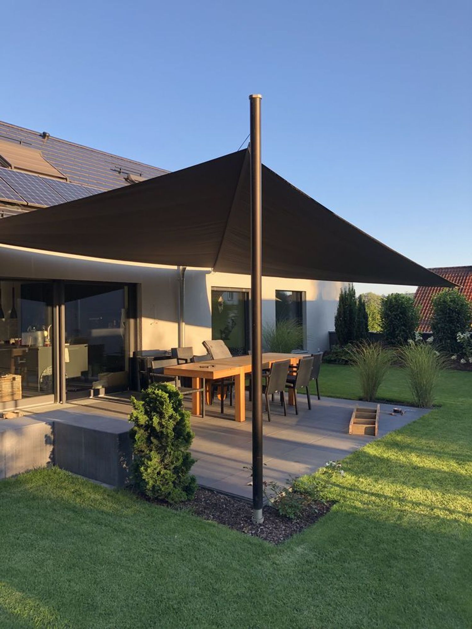 Zonas de sombra para la terraza, especialmente en el área de estar y sobre la mesa del comedor. Nuestro jardín suele ser ventoso y los paraguas vuelan con facilidad, por eso pensamos en velas de sombra desmontables para el verano; necesitamos ideas sobre dónde colocar los postes;
