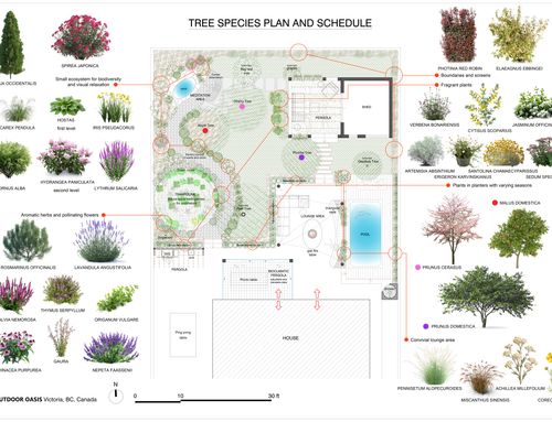 Tra le piante native: rododendri, salal, corniolo e cedri (vedi elenco nel documento collegato).