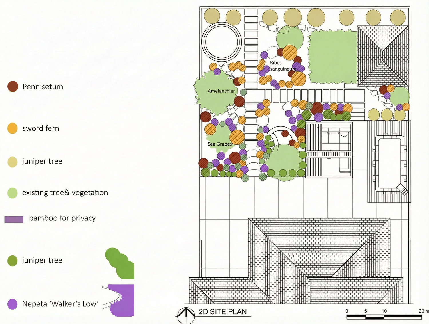 Thank you for sharing your vision for a cohesive, comfortable, pollinator-friendly backyard. This design uses your existing trees, respects the sunken garden grade, softens the modern concrete deck, and incorporates native plants that thrive in Victoriaās climate.