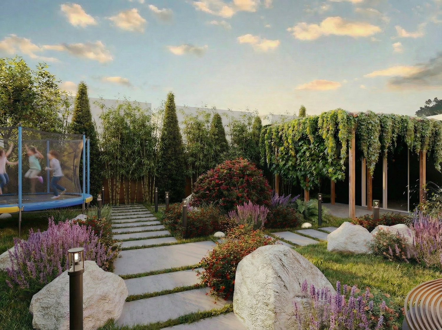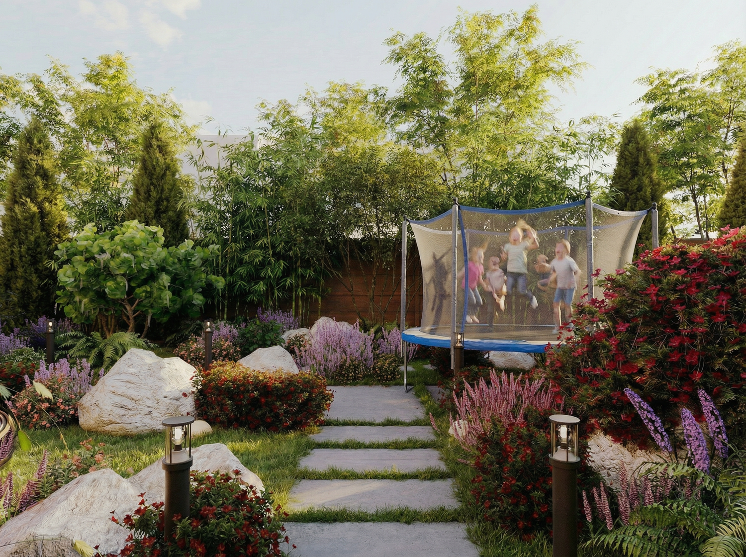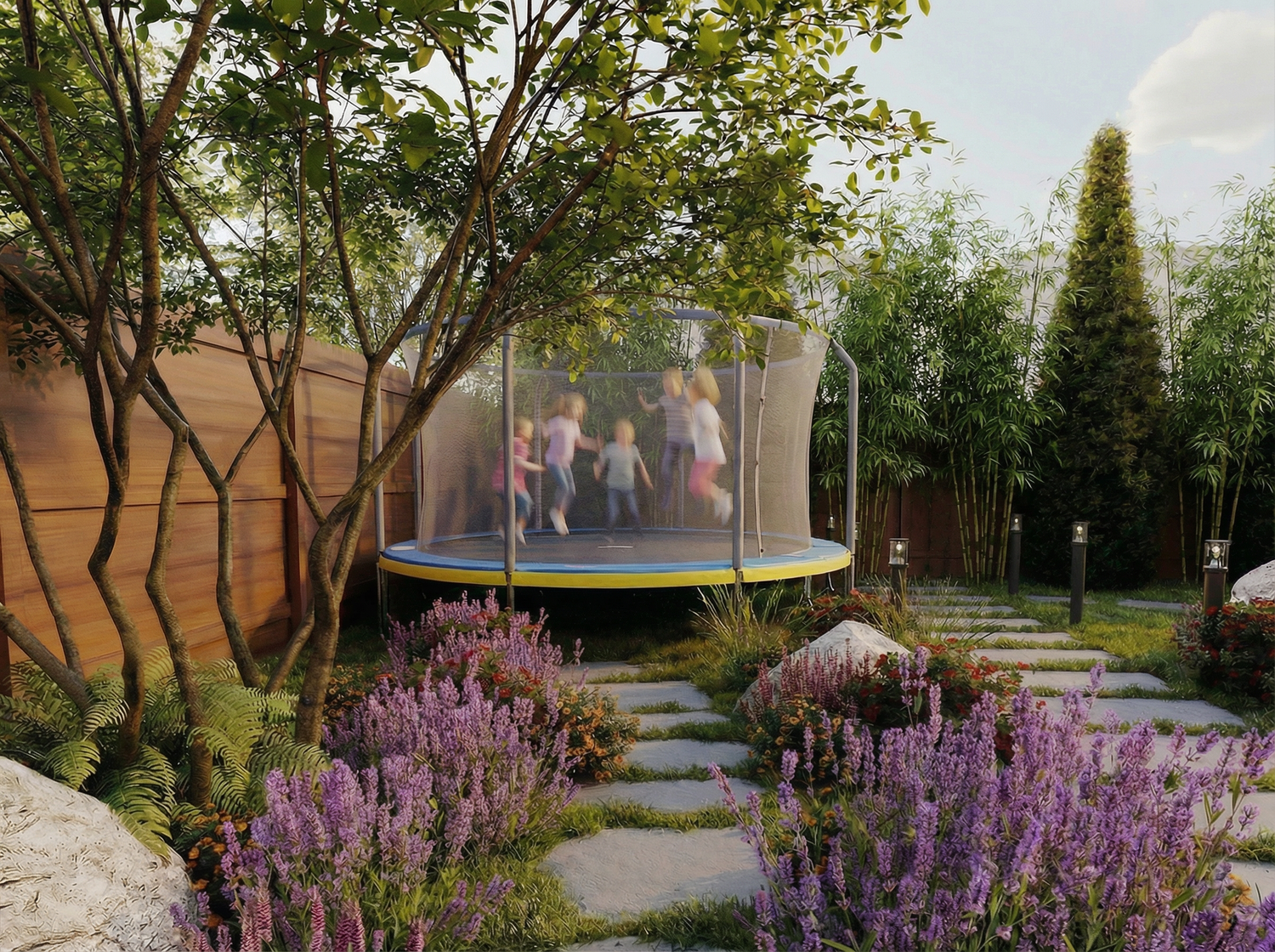 Plant choices near the trampoline are durable enough for future transitions when the trampoline is removed.