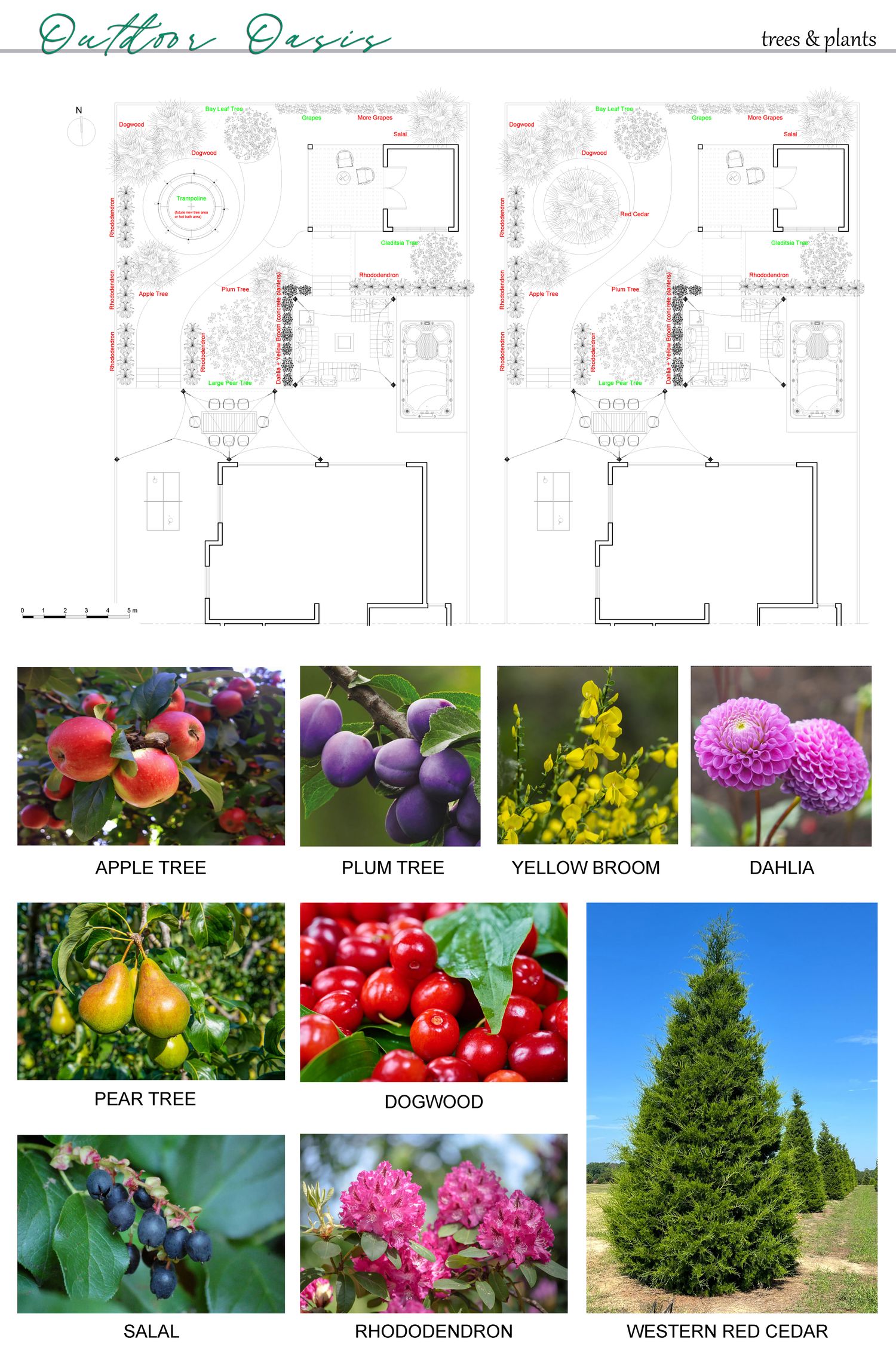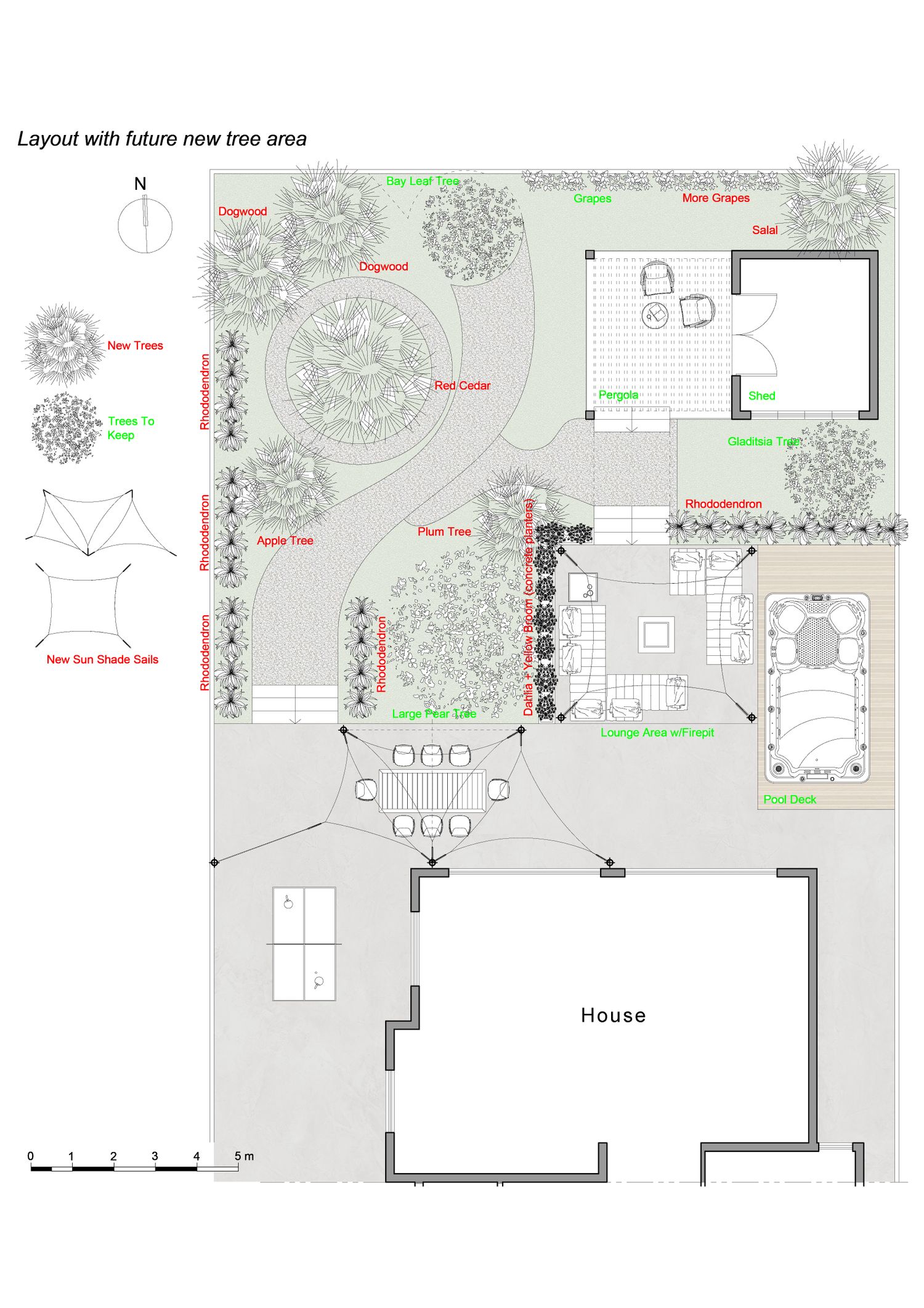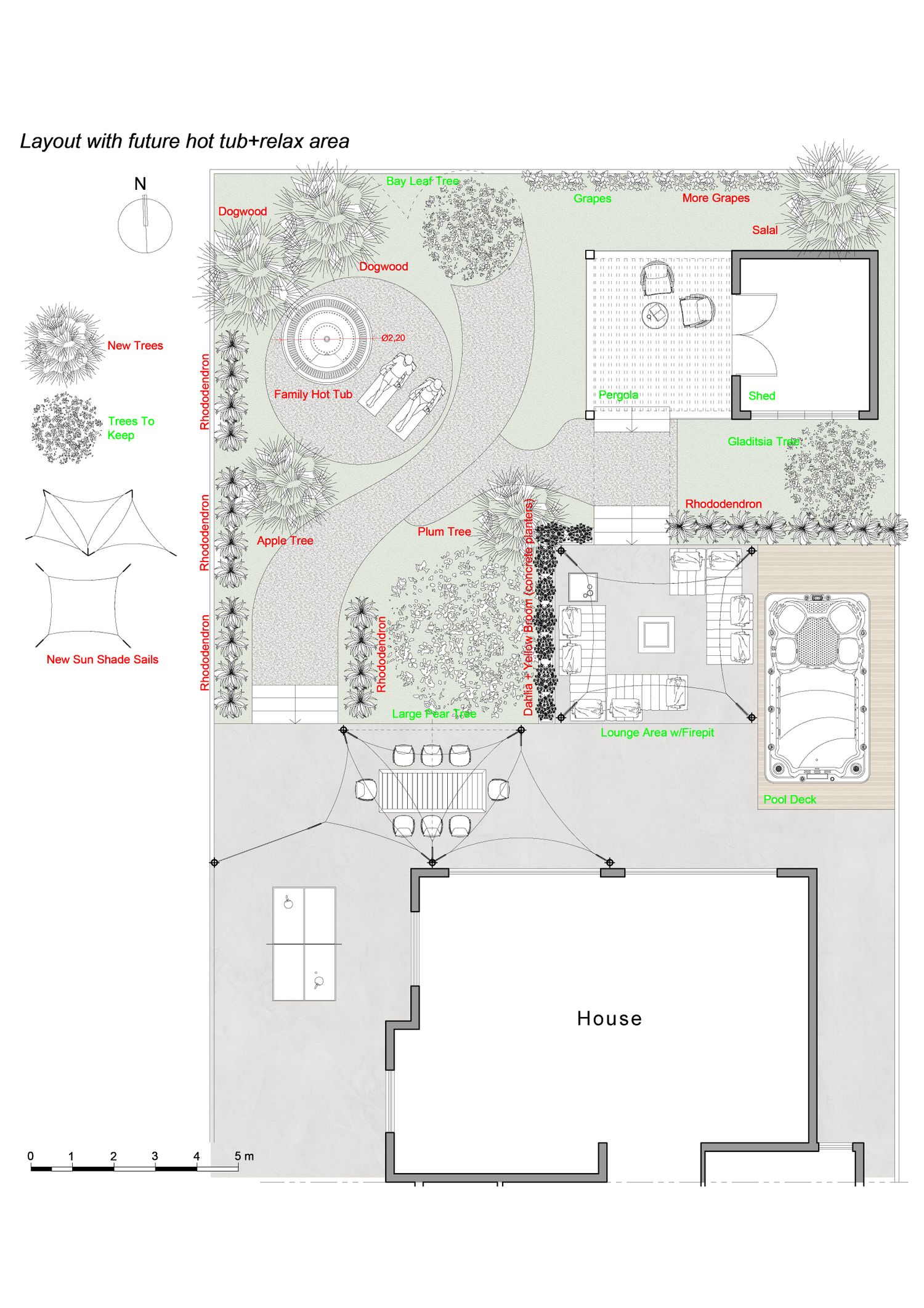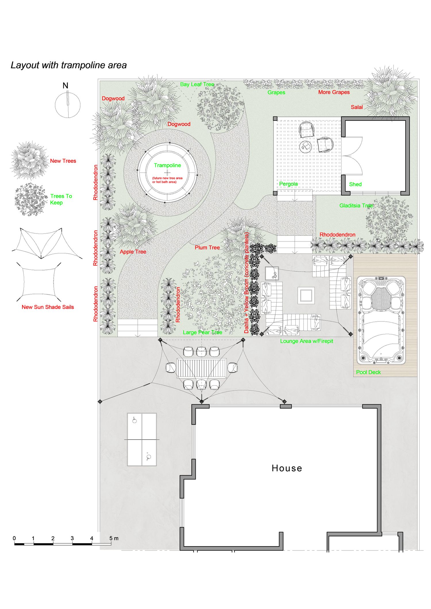 Our project creates a small green oasis for play and relaxation, with two possible options for the future use of the trampoline space. A cobblestone path is planned, as well as a slight shift in the steps that bridge the height differences between the green and paved areas (concrete deck/sofa and dining area, shed/pergola area), to align them and make the garden more comfortable.