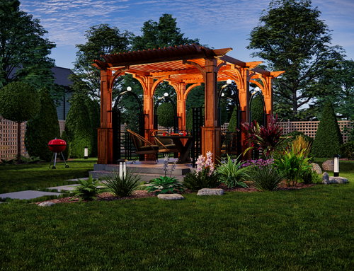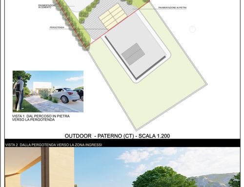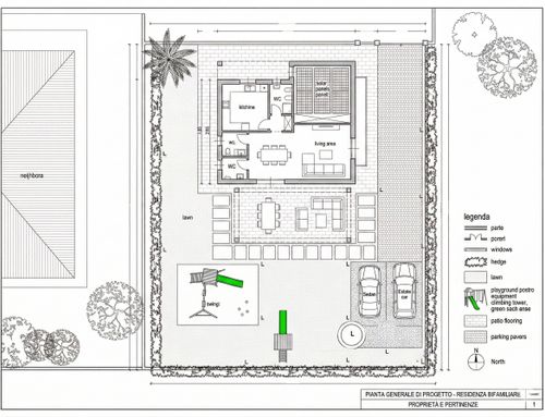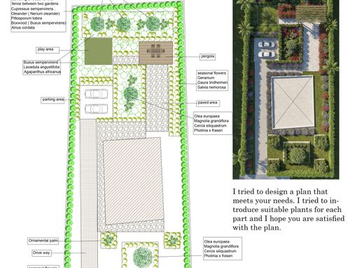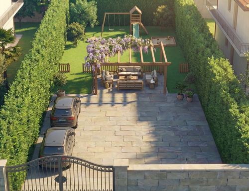 Progettazione di un giardino con pergola 3x6 o 4x6 e zona pavimentata di circa 4x10mt lato confinante con la casa, una zona parcheggio per due auto, siepi ai lati per fare da schermo dai vicini e la zona di giardino rimanente deve essere vivibile ai bambini per poterci giocare