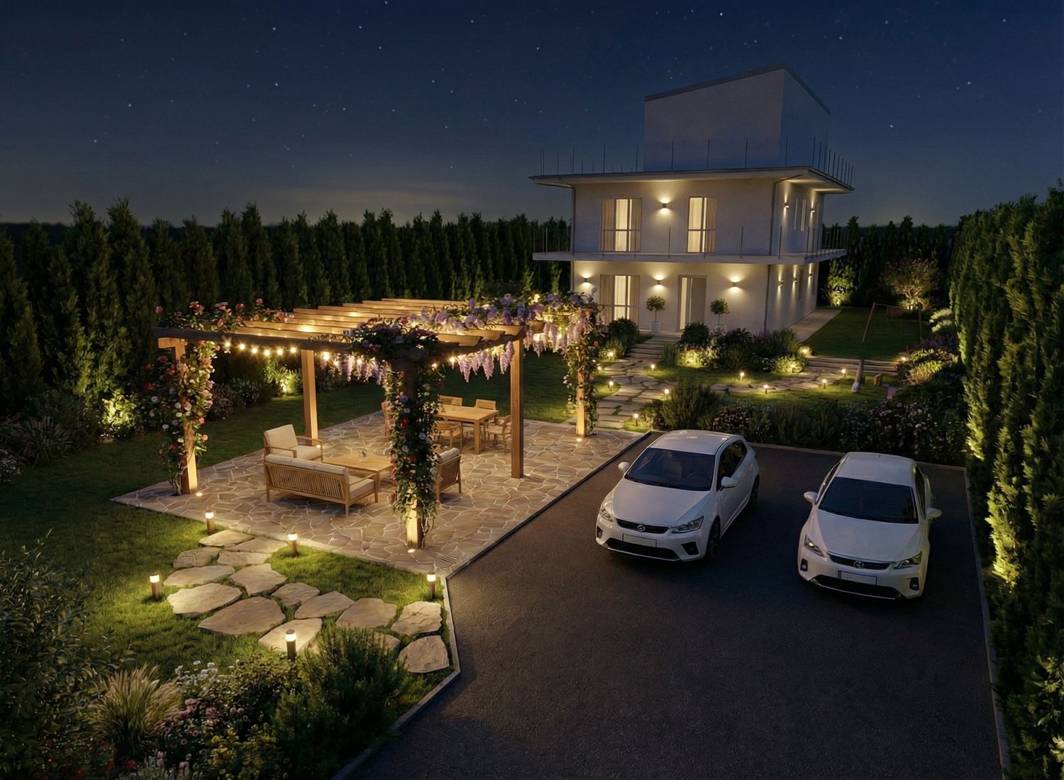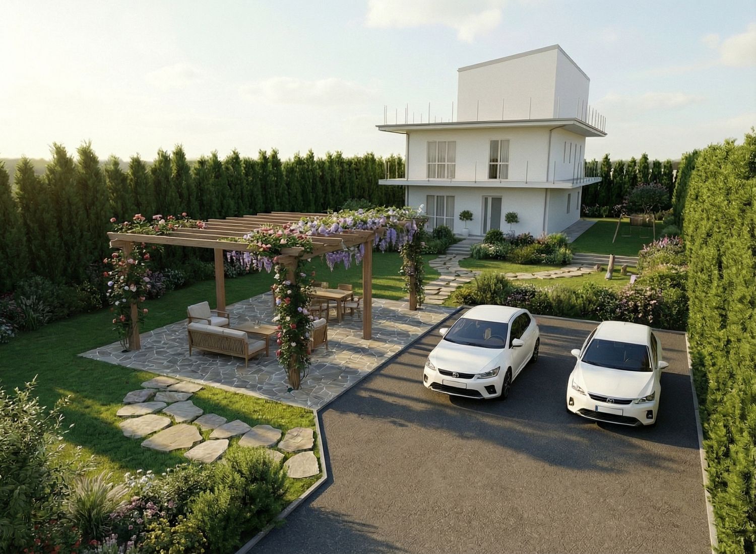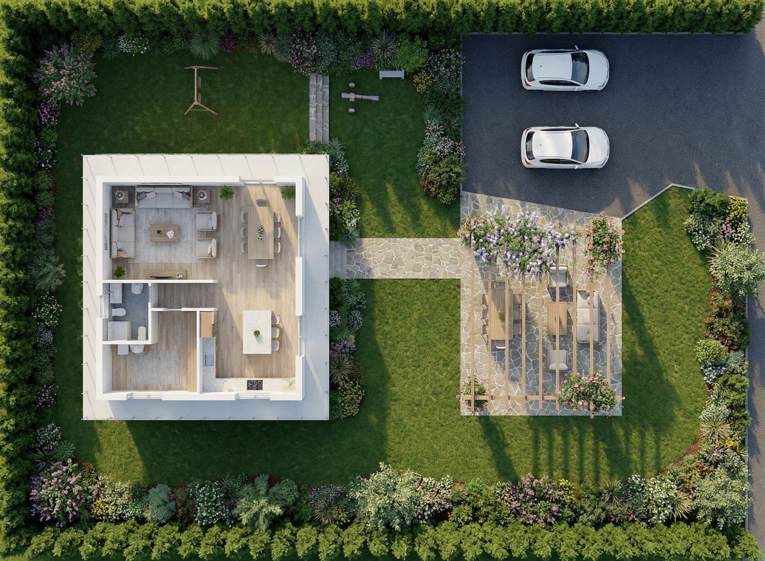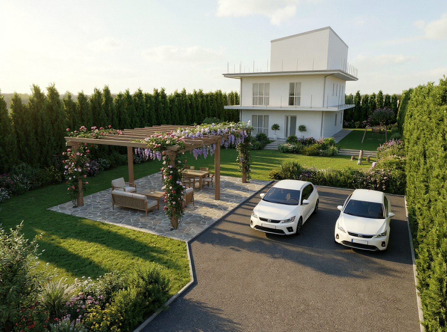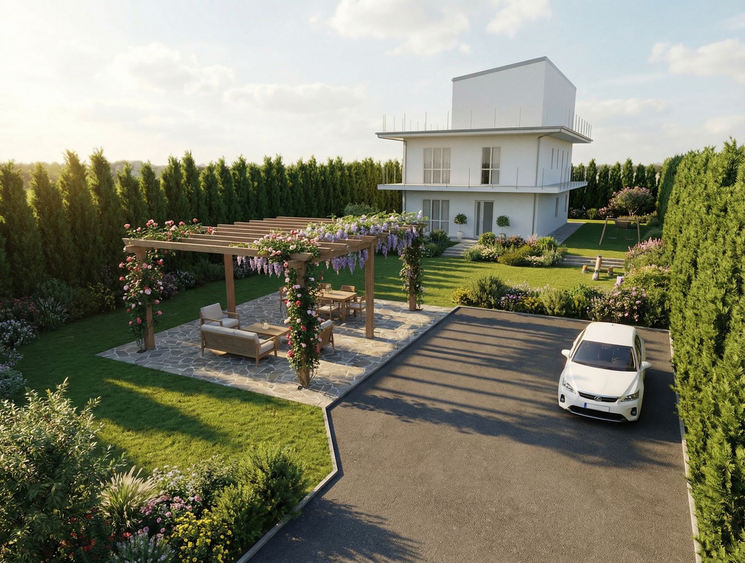 Abbiamo realizzato la disposizione del giardino, inclusi parcheggio, pergola e area giochi per bambini, come da vostra descrizione. L’abbiamo organizzata in base alle vostre preferenze e alle relative funzionalità. Speriamo che sia conforme a quanto desiderate.
