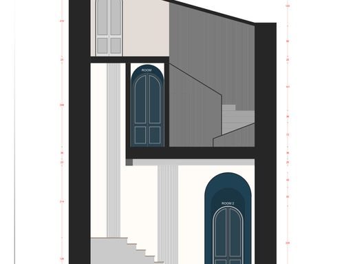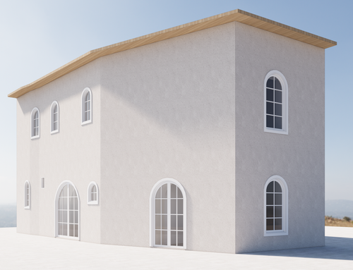 Currently, the building has a total surface area of approximately 140 sqm, distributed over a ground floor, a first floor, and a mezzanine floor.