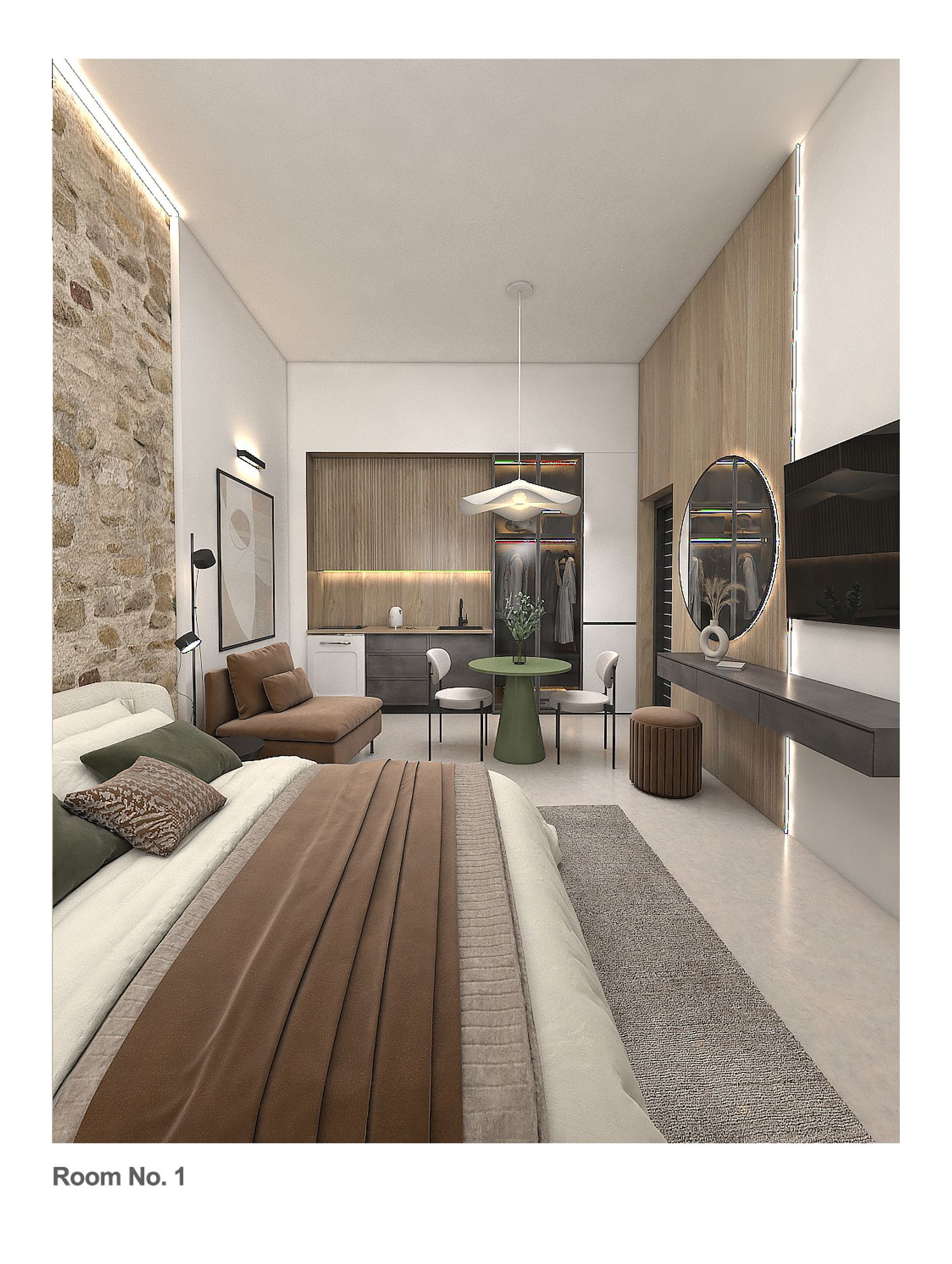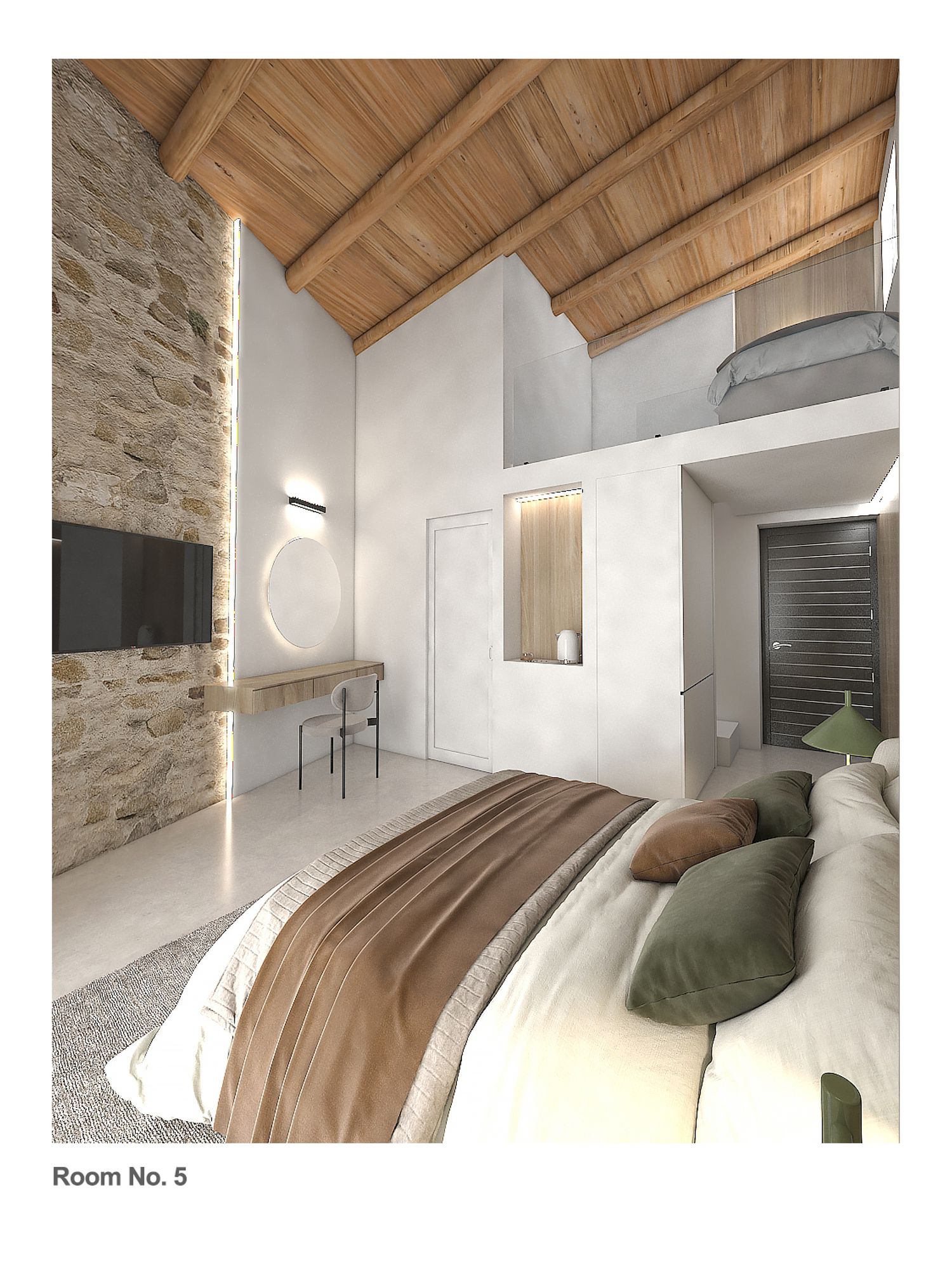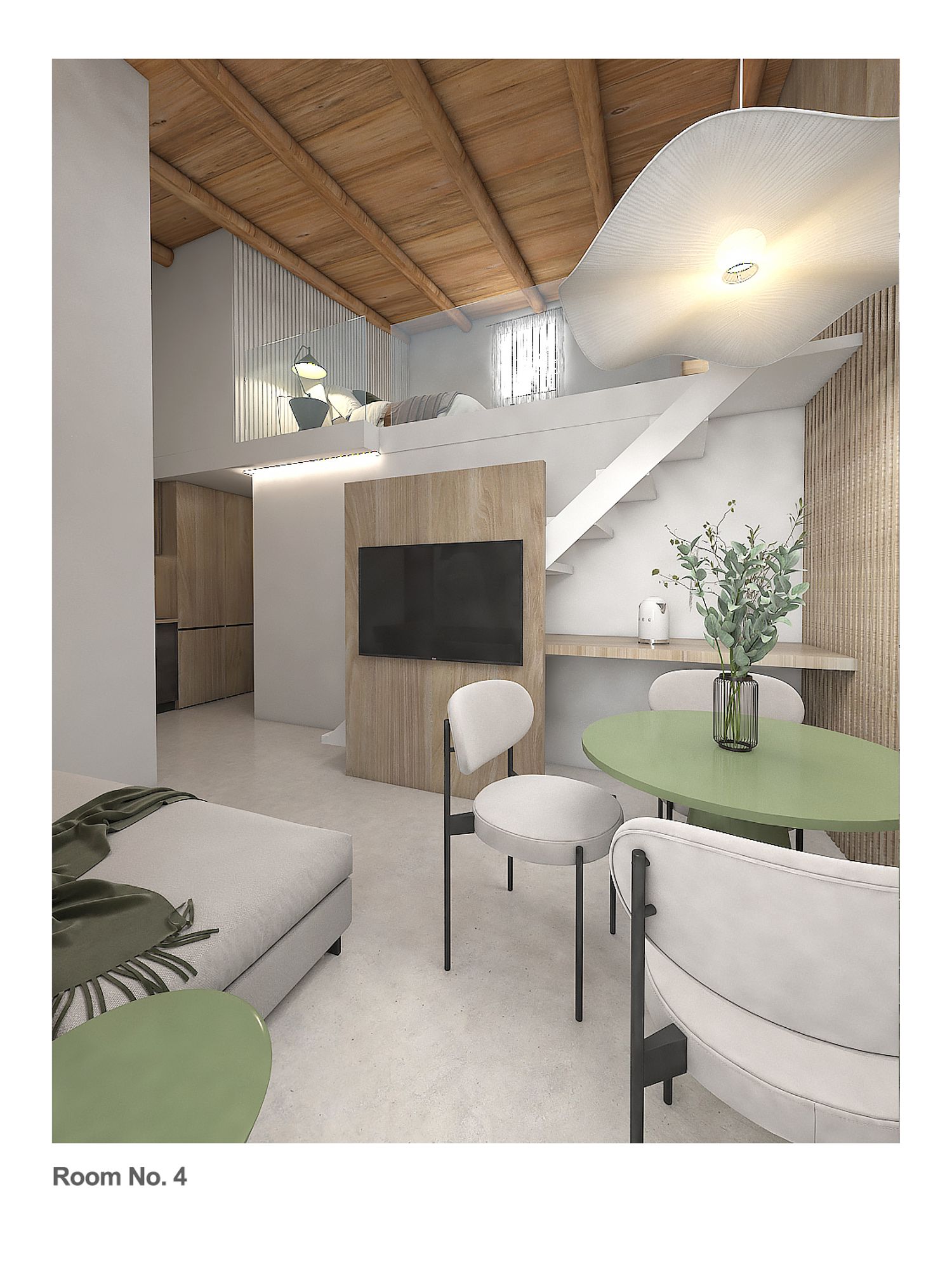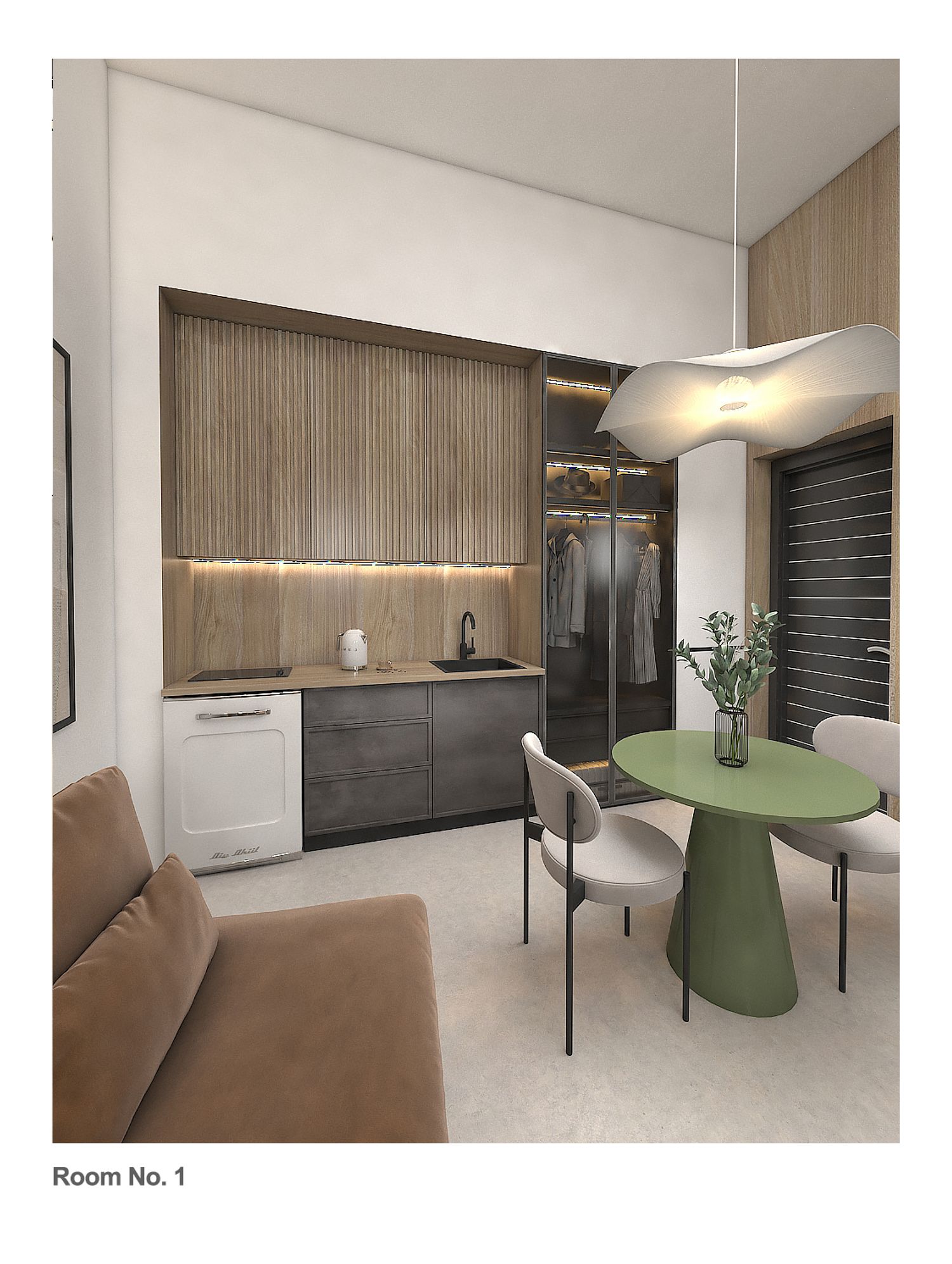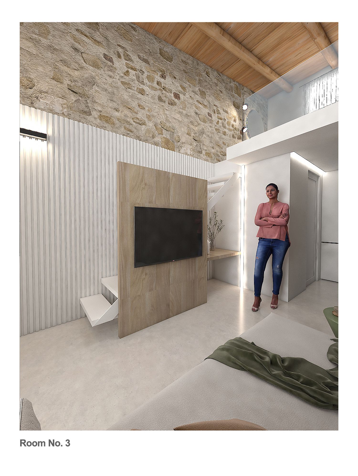 Two rooms have a small kitchen, one of which is planned on the first floor and the other on the ground floor to be used by guests who have difficulty navigating the stairs to the upper floor.
